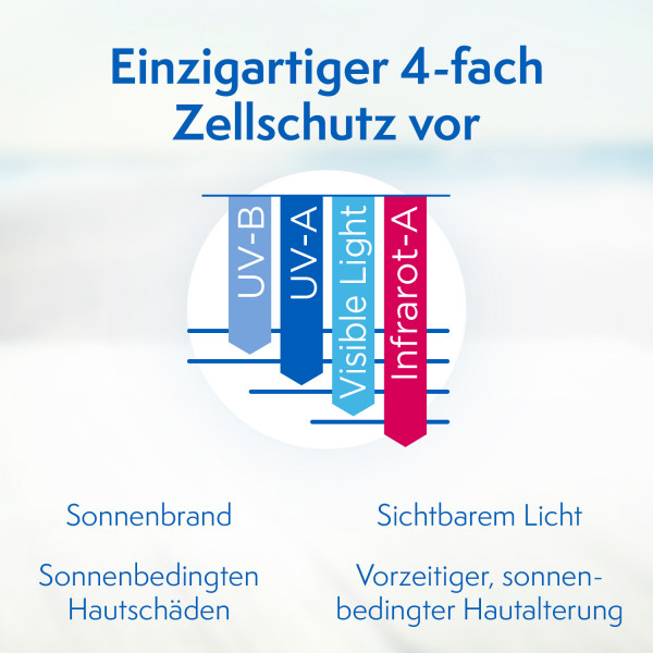 - Einzigartiger 4-fach Zellschutz vor Sonnenbrand, sonnenbedingten Hautschäden, sichtbarem Licht und vorzeitiger, sonnenbedingter Hautalterung.