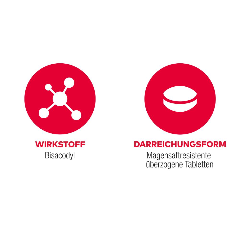 Der Wirkstoff Bisacodyl hat eine abführende Wirkung und erleichtert die Darmentleerung. Er hemmt die Aufnahme von Wasser aus dem Darm und steigert die Abgabe von Wasser und Elektrolyten. Dadurch wird der Stuhl weicher und nimmt an Volumen zu, was die Darmbewe-gung anregt. Bisacodyl eignet sich zur kurzfristigen Anwendung bei Verstopfung und sollte nicht kontinuierlich über einen längeren Zeitraum eingenommen werden, da dies zu Elektrolytstörungen und Flüs-sigkeitsverlusten führen kann. Zudem wird die Darmträgheit verstärkt. Eine längerfristige Anwendung sollte daher nur unter ärztlicher Kontrolle erfolgen.