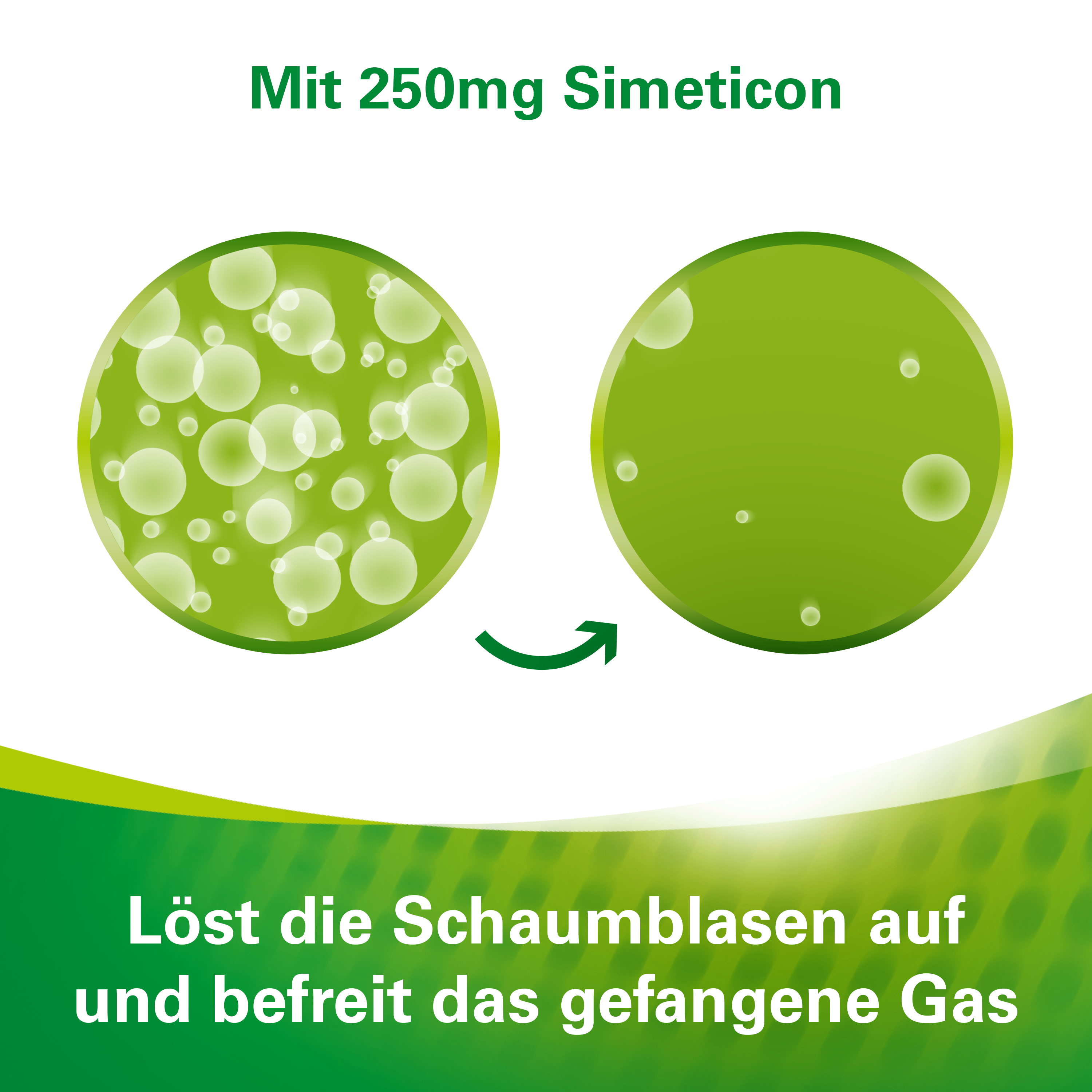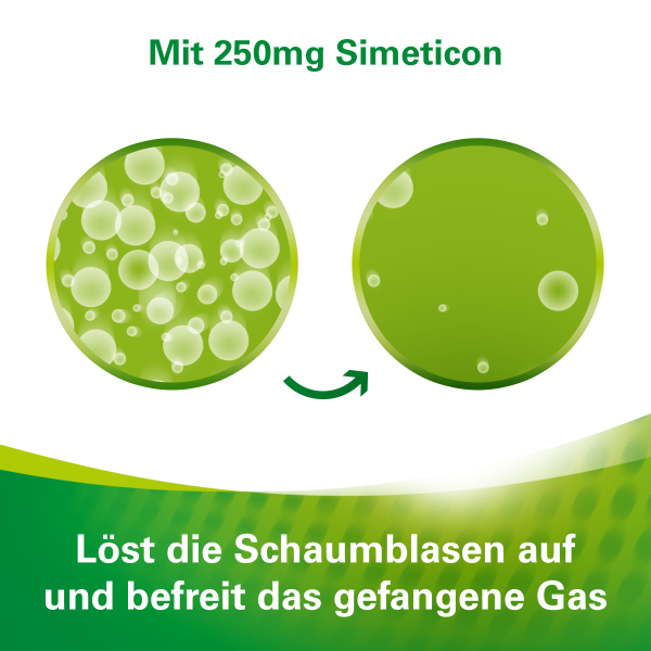 Dieses Medizinprodukt enthält Simeticon, eine Substanz mit entschäumender und schaumverhütender Wirkung. Es wird angewendet zur Linderung und symptomatischen Behandlung gasbedingter Magen-Darm-Beschwerden (z.B. Blähungen, Völlegefühl, Aufstoßen).