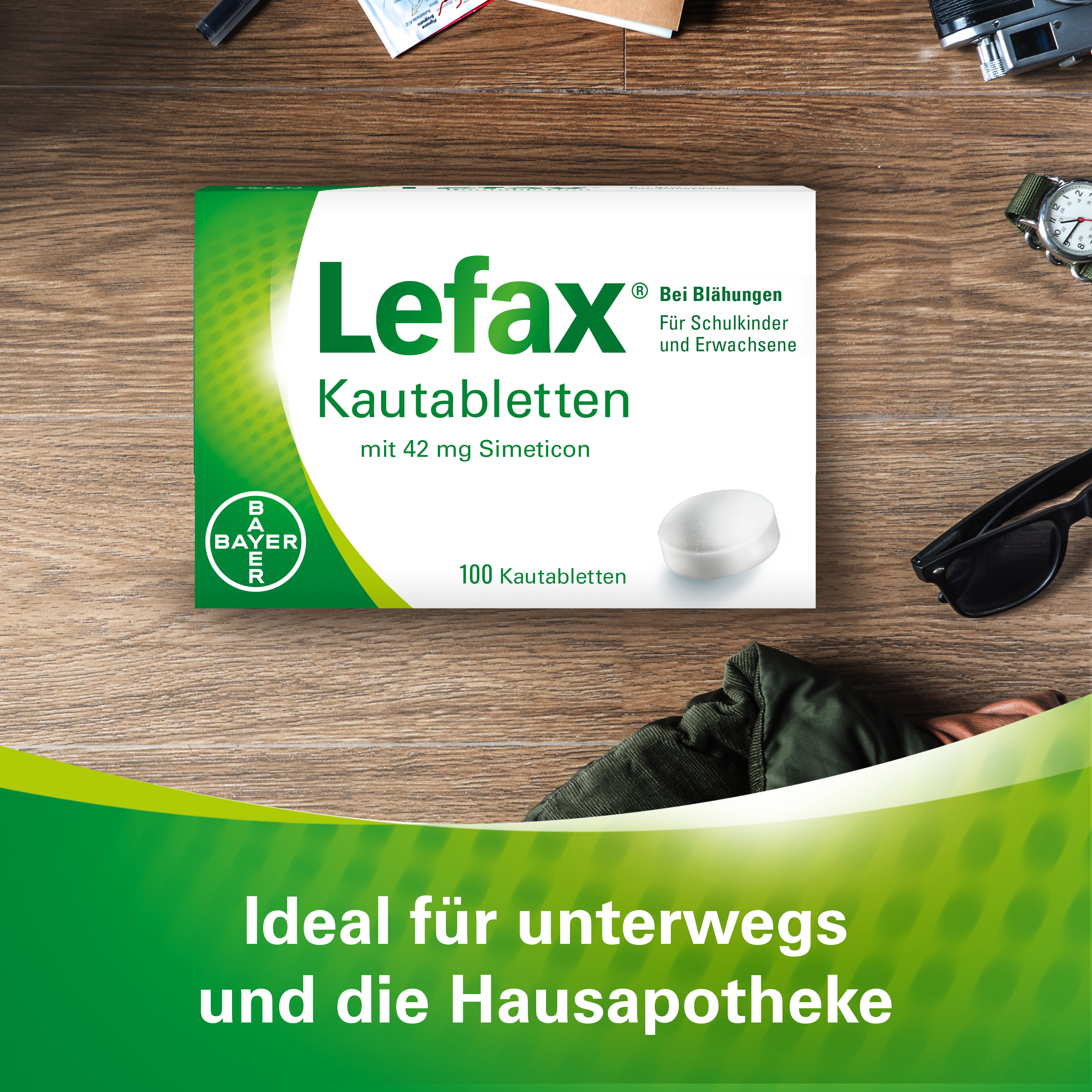 Die Lefax® Kautabletten können Sie ganz ohne Wasser einnehmen – sie sind somit bestens geeignet für unterwegs. Sie müssen die Tabletten lediglich gründlich zerkauen. Nehmen Sie die Lefax® Kautabletten immer zu oder nach den Mahlzeiten ein. Die Einnahme kann bei Bedarf auch vor dem Schlafengehen erfolgen.
