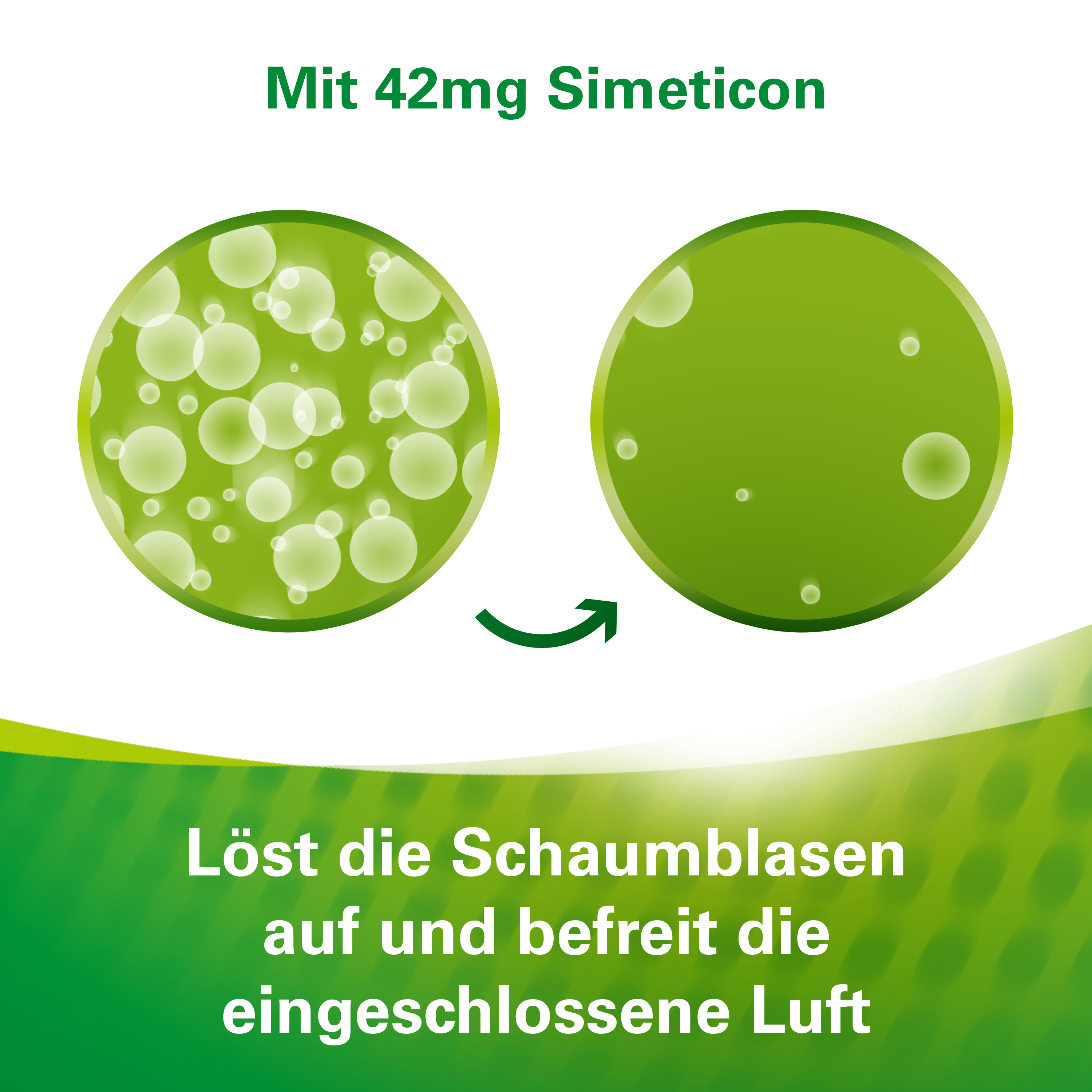 Lefax löst die Luftblasen auf und verhindert Neubildung von Luft im Bauch.