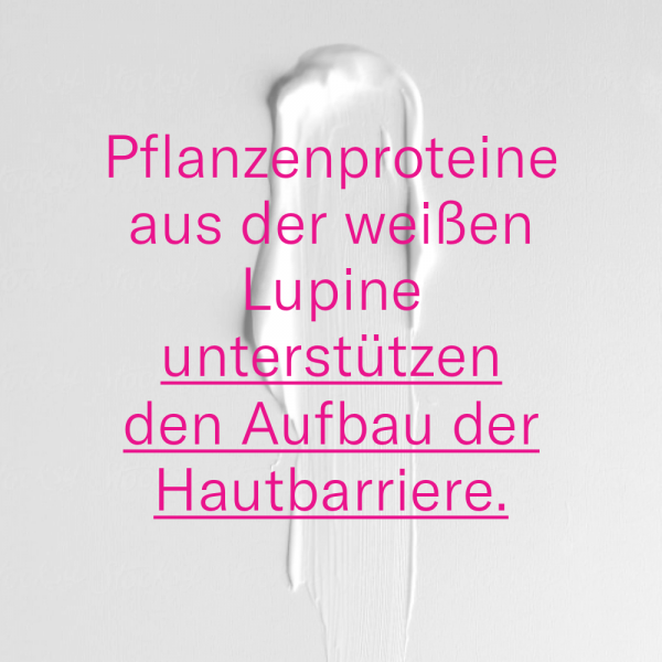 Pflanzenproteine aus der weißen Lupine unterstützen den Aufbau der Hautbarriere, mehrfachzucker pflanzlichen Ursprungs fördern das Mikrobiom-Gleichgewicht, extrakte aus Apfel und Pfirsich schützen vor reizenden Umweltfaktoren (wie z. B. Luftverschmutzung).