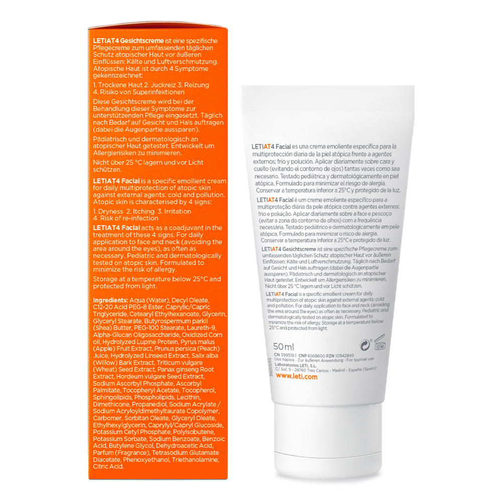 LETI AT4 Gesichtscreme schützt die Haut vor Kälte, Luftverschmutzung sowie Pollen- und Milbenallergenen, indem sie die gestörte Hautbarriere repariert und so das Hautmikrobiom wieder ins Gleichgewicht bringt. Die leichte, dennoch reichhaltige Tagespflege lindert Reizungen und Entzündungen bei trockener oder zu Neurodermitis neigender Haut. Entwickelt für Babys ab 3 Monaten, Kinder und Erwachsene.