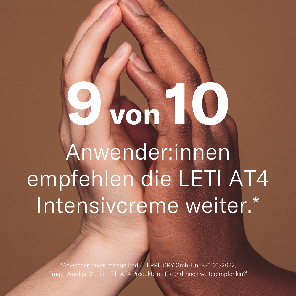 Das „AT“ in LETI AT4 steht stellvertretend für „ATopisch“ – die „4“ für die Wirksamkeit der Pflegelinie gegen die 4 typischen Symptome einer atopischen Dermatitis bzw. Neurodermitis wie: Hauttrockenheit, Juckreiz, Hautreizungen und die Neigung zu Superinfektionen (eine Überinfektion der Haut mit verschiedenen Erregern).