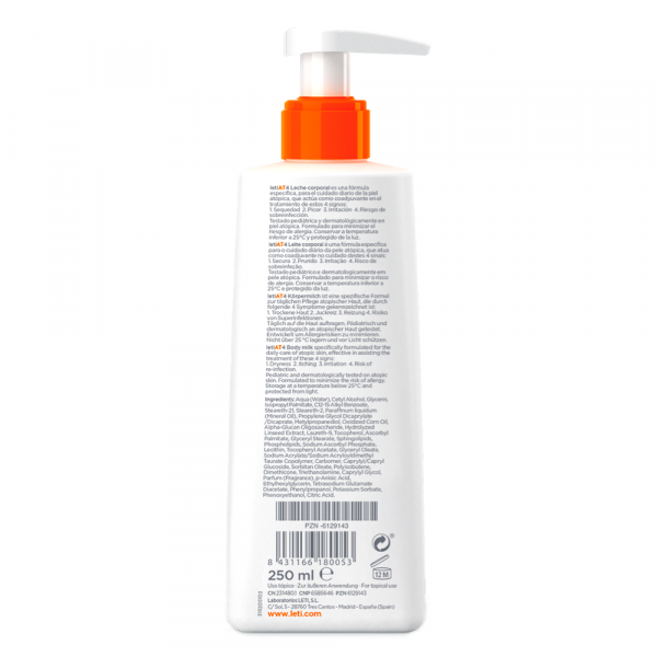 Die LETI AT4 Körpermilch wurde pädiatrisch und dermatologisch an allergisch* vorbelasteter Haut getestet. Sie enthält keine Parabene.