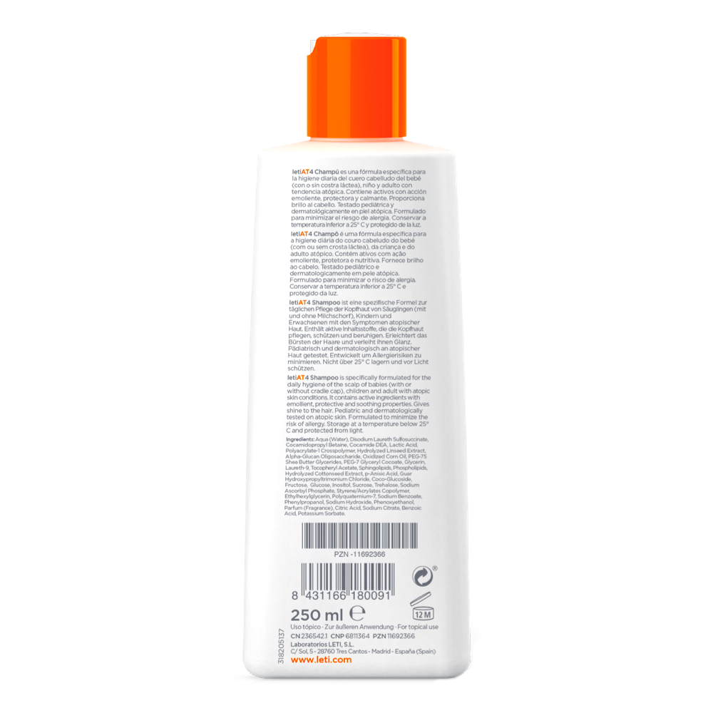 Das „AT“ in LETI AT4 steht stellvertretend für „ATopisch“ – die „4“ für die Wirksamkeit der Pflegelinie gegen die 4 typischen Symptome einer atopischen Dermatitis bzw. Neurodermitis wie: Hauttrockenheit, Juckreiz, Hautreizungen und die Neigung zu Superinfektionen (eine Überinfektion der Haut mit verschiedenen Erregern).