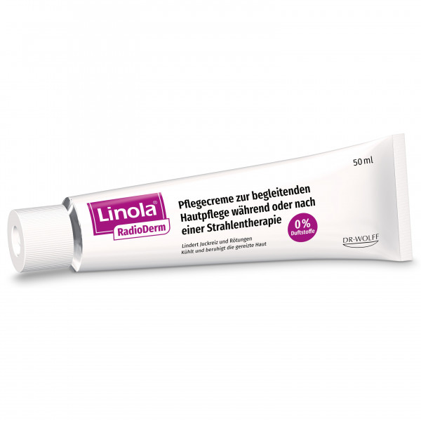 Die Linola RadioDerm Pflegecreme wurde speziell für die Bedürfnisse der Haut unter Strahlentherapie entwickelt. Die Öl-in-Wasser-Emulsion beruhigt die strapazierte Haut und sorgt für eine angenehme Kühlung. Sie lässt sich sehr leicht verteilen, lindert Juckreiz und Rötungen. Wertvolle Linolsäuren unterstützen die Regeneration der Hautschutzbarriere. Die Verträglichkeit der Creme nach einer Bestrahlung ist dermatologisch bestätigt.