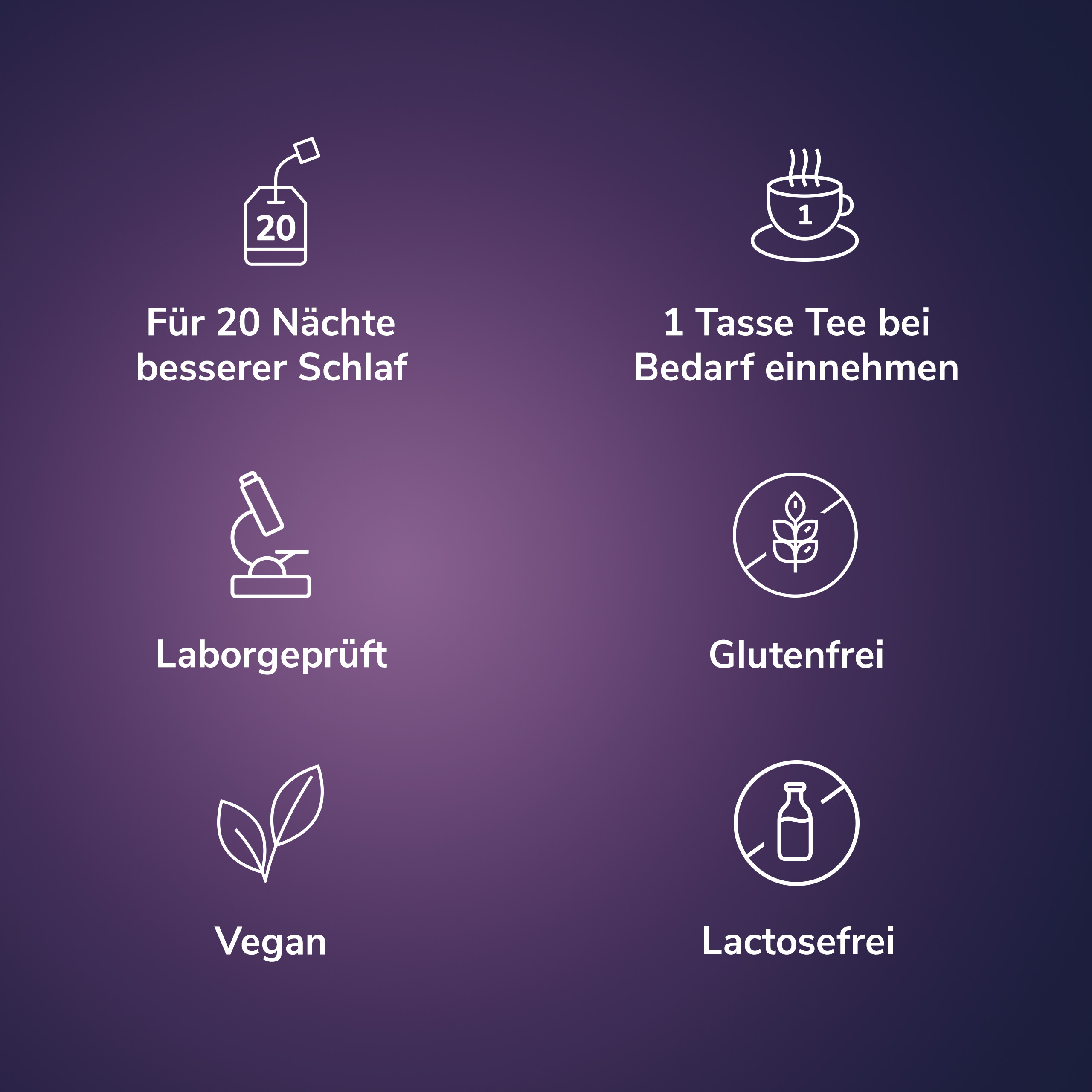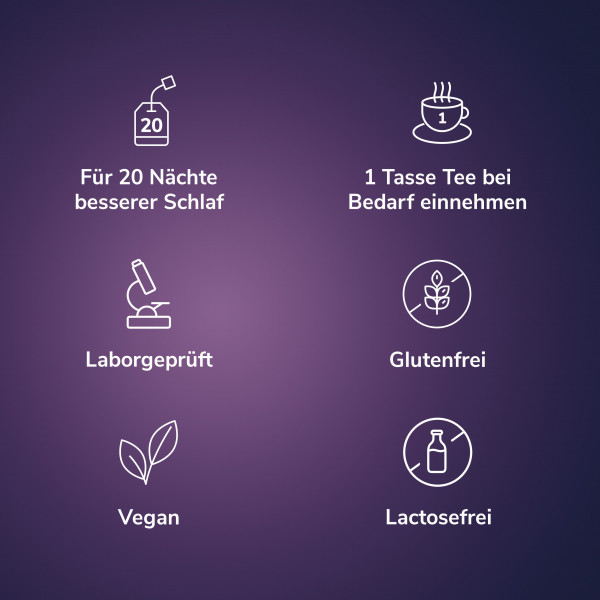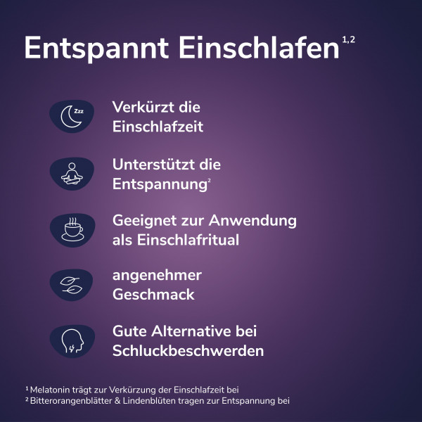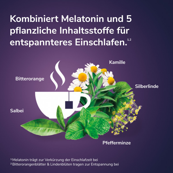- gut verträglich: Einschlaftee mit Melatonin und fünf pflanzlichen Inhaltsstoffen
