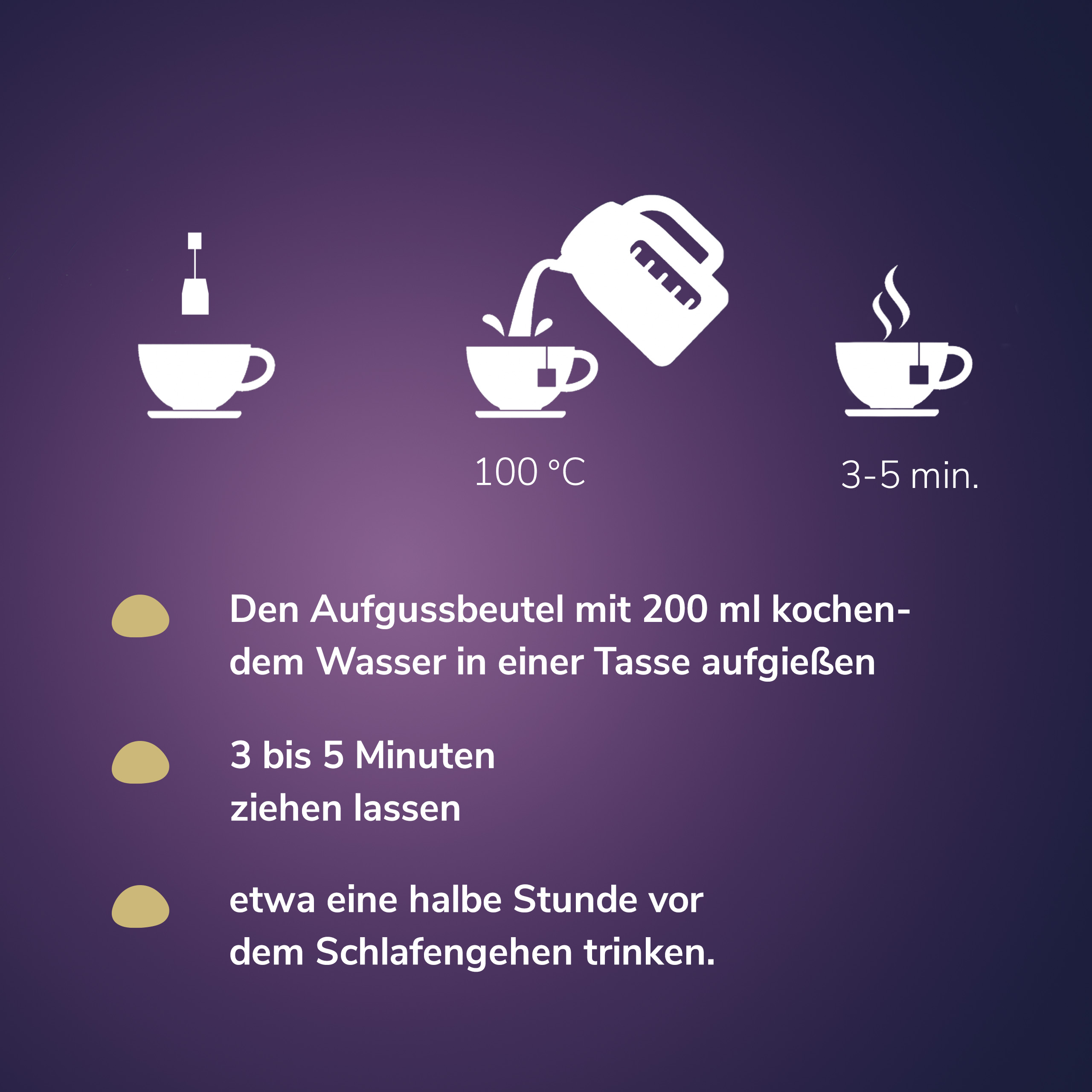 Lunalaif® Guter Schlaf Heißgetränk ist ideal als Schlafgetränk vor dem Zubettgehen. Die wohltuende Wärme eines heißen Tees vor dem Schlafengehen lässt einen zur Ruhe kommen. Während 1 mg Melatonin dabei hilft, schneller in den Schlaf zu finden¹, tragen die im Tee enthaltenen Bitterorangenblätter und Lindenblüten zur Entspannung bei². So unterstützt der Einschlaftee von Lunalaif® dank Melatonin und pflanzlicher Inhaltsstoffe auf natürliche Weise den Schlaf-Wach-Rhythmus und trägt dazu bei, Einschlafprobleme zu reduzieren. Damit sich die Wirkung des Melatonins entfalten kann, sollte der Einschlaftee 30 bis 60 Minuten vor dem Schlafengehen getrunken werden. Für die Zubereitung wird ein Aufgussbeutel von Lunalaif® Guter Schlaf Heißgetränk mit 200 ml kochendem Wasser in eine Tasse gegeben. Die Ziehzeit beträgt 3 bis 5 Minuten.