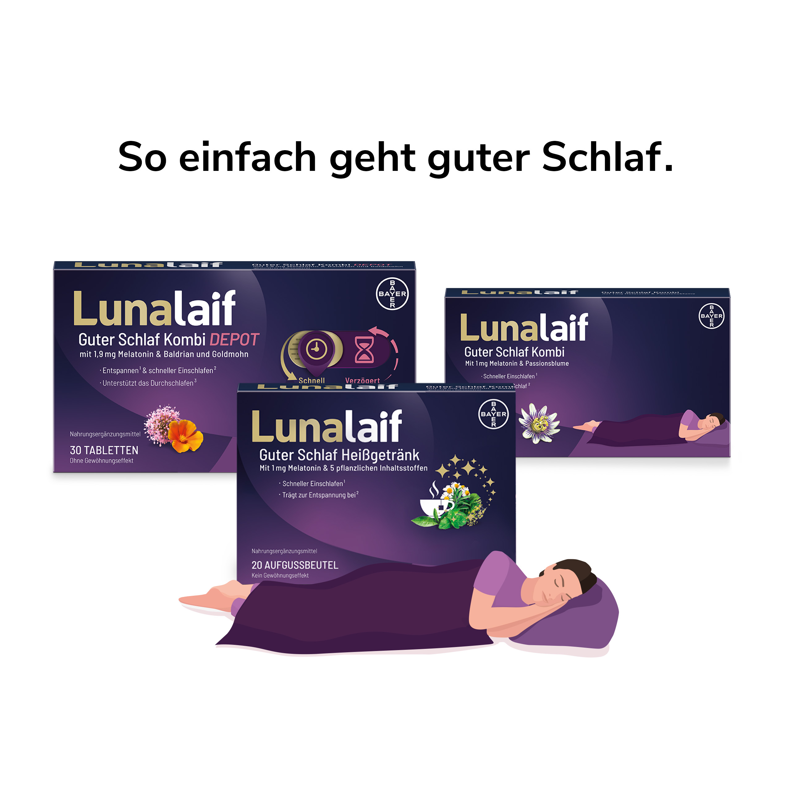 Schlafstörungen sind ein präsentes Problem in unserer Gesellschaft: 40 % der deutschen Bevölkerung finden keinen erholsamen Schlaf, jede dritte Person leidet an Schlafproblemen. Ob Stress, Krankheiten oder Arbeiten im Schichtdienst: Probleme mit dem Ein- und Durchschlafen können viele Ursachen haben. Auch unser modernes Leben mit zu vielen Stunden vor dem Bildschirm und zu wenig Zeit im Freien führt oft zu Schlaflosigkeit. Das alles kann den Tag-Nacht-Rhythmus und den Hormonspiegel mitunter so sehr aus dem Gleichgewicht bringen, dass das für die einsetzende Müdigkeit verantwortliche „Schlafhormon“ Melatonin vom Körper nicht in ausreichenden Mengen oder zu den falschen Uhrzeiten ausgeschüttet wird. Halten die Schlafprobleme über einen längeren Zeitraum an, kann dies zu Energielosigkeit, einem Leistungsabfall und Konzentrationsschwierigkeiten führen. Länger anhaltender Schlafmangel kann darüber hinaus viele Erkrankungen begünstigen. Doch das muss nicht sein. Lunalaif® Guter Schlaf Heißgetränk ist eine natürliche Einschlafhilfe, die Melatonin mit ausgewählten pflanzlichen Inhaltsstoffen kombiniert und dem Körper dabei hilft, zur Ruhe zu kommen² und schneller in einen erholsamen Schlaf zu finden¹. Insbesondere bei Personen mit Schluckbeschwerden, für die ein Einschlafprodukt in Tablettenform ungeeignet ist, bietet sich ein Getränk mit Melatonin zum besseren Einschlafen an. Die einfache Anwendungsform und seine gut verträglichen Inhaltsstoffe machen den Tee zum perfekten Helfer für ein regelmäßiges Einschlafritual: Da keine Abhängigkeit und kein Gewöhnungseffekt entstehen, kann Lunalaif® Guter Schlaf Heißgetränk ohne Bedenken für die tägliche Schlafroutine verwendet werden.