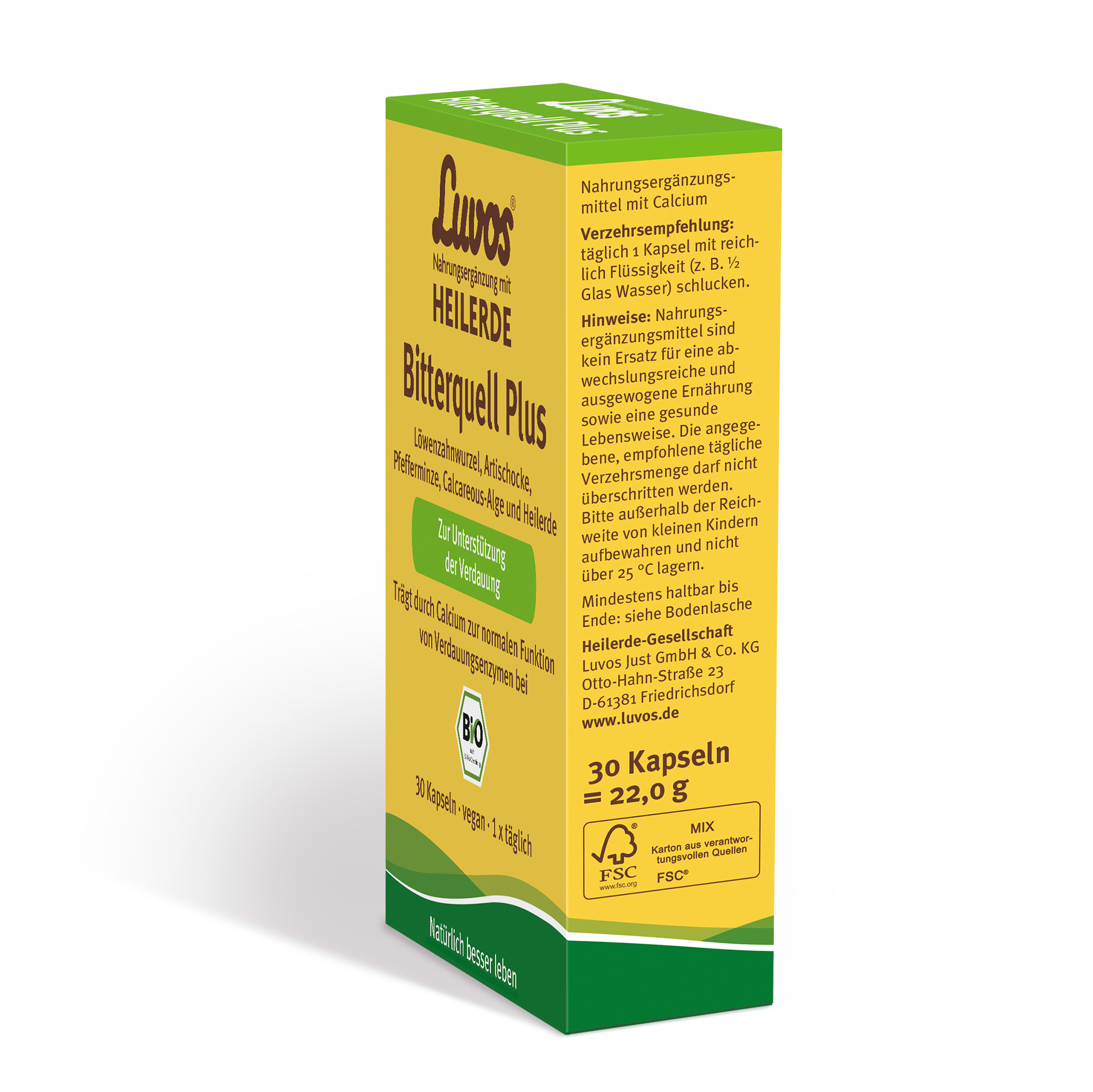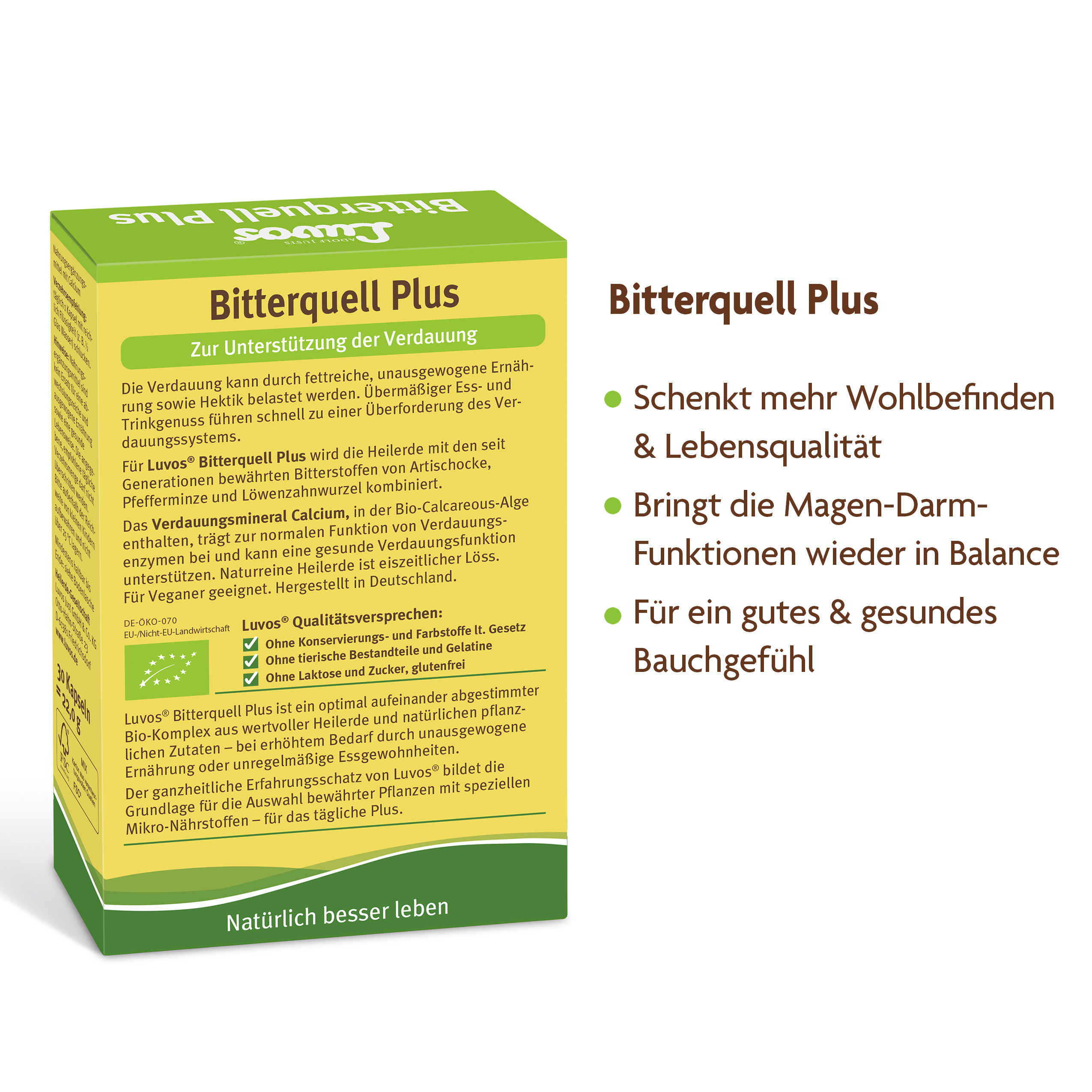Luvos Bitterquell Plus ist ein optimal abgestimmter Bio-Komplex mit Heilerde und natürlichen, bio-zertifizierten Zutaten. Das hochwertige Naturprodukt kombiniert die Heilerde mit bewährten pflanzlichen Naturstoffen: Bio-Artischocke, Bio-Pfefferminze und Bio-Löwenzahnwurzel. Das Verdauungsmineral Calcium, in der Bio-Calcareous-Alge enthalten, trägt zur normalen Funktion von Verdauungsenzymen bei und kann eine gesunde Verdauungsfunktion unterstützen.