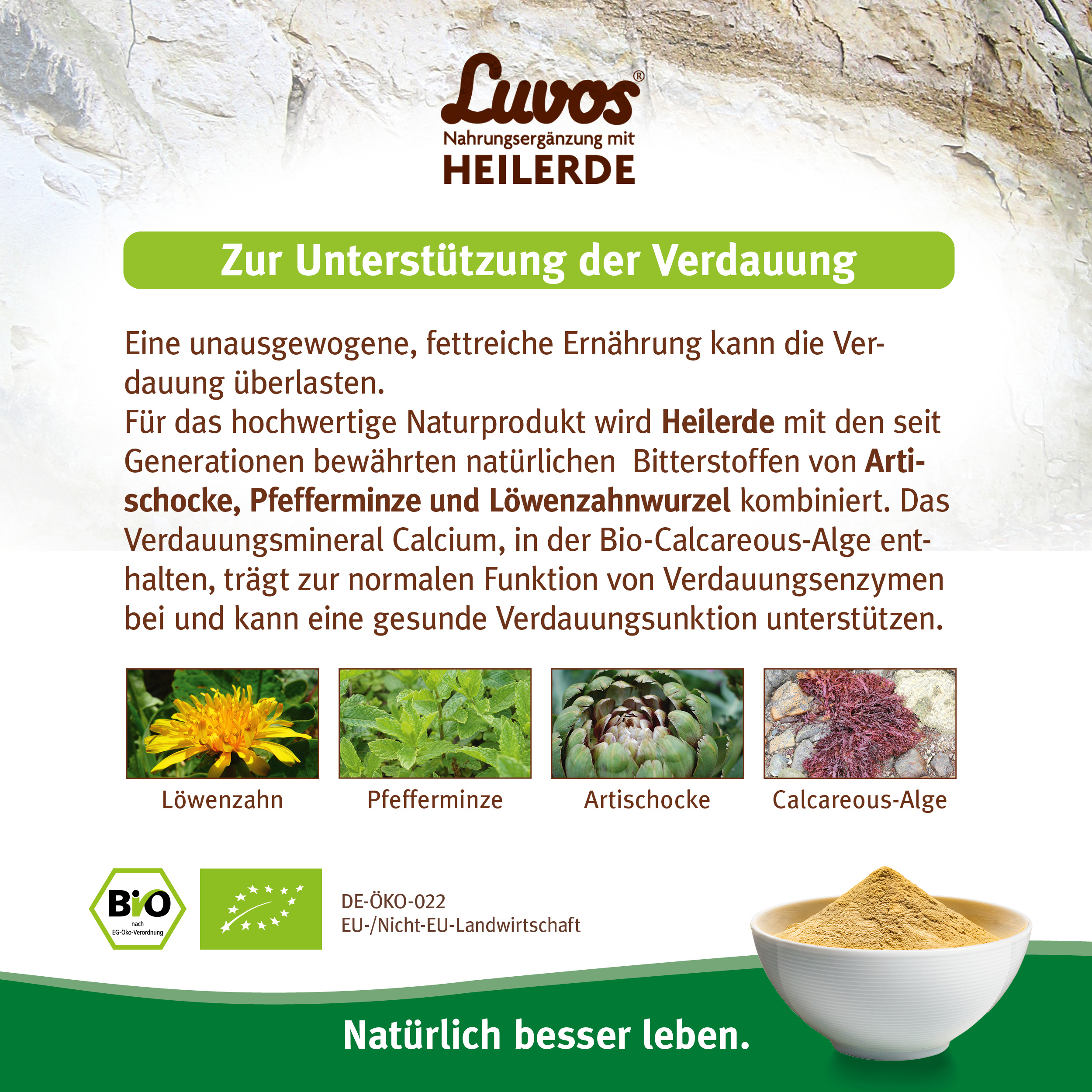 Dieses Produkt basiert auf dem Erfahrungsschatz von Luvos – unterstützt von moderner Wissenschaft. Es ist ein optimal aufeinander abgestimmten Bio-Komplex mit wertvoller Heilerde und natürlichen pflanzlichen Zutaten aus kontrolliert biologischem Anbau.