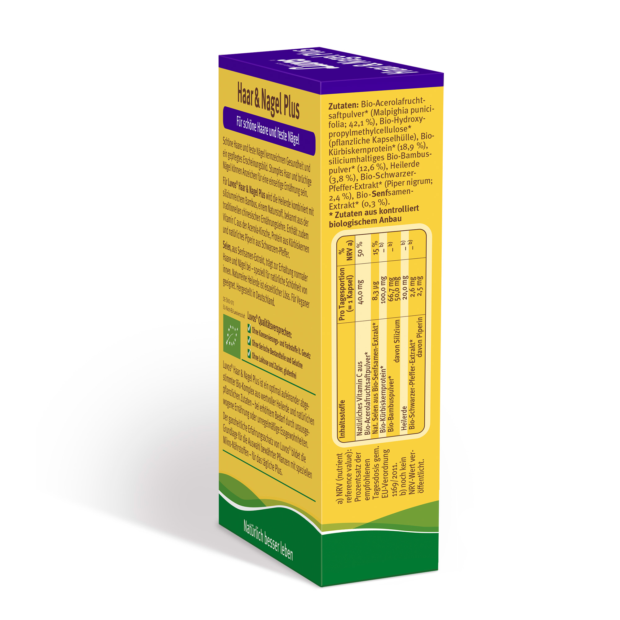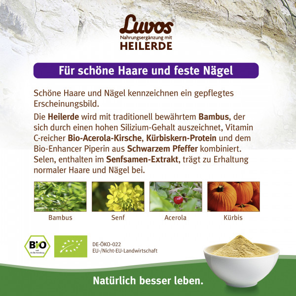 Luvos Haar & Nagel Plus ist ein optimal abgestimmter Bio-Komplex mit Heilerde und bio-zertifizierten pflanzlichen Zutaten. In dem hochwertigen Naturprodukt ist Heilerde mit bewährten pflanzlichen Naturstoffen kombiniert: mit siliziumreichem Bio-Bambus, Bio-Senfsamen-Extrakt, Bio-Kürbiskern-Protein und dem Bio-Enhancer Piperin aus Schwarzem Pfeffer. Enthält zudem Vitamin C aus der Acerola-Kirsche. Selen, aus dem Senfsamen-Extrakt, trägt zur Erhaltung normaler Haare und Nägel bei.