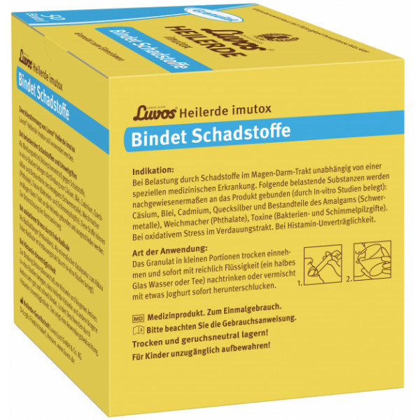 Adolf Justs Luvos® Heilerde imutox Pulver ist ein Medizinprodukt, das zur Unterstützung des Organismus bei der Körperentgiftung, Darmsanierung, Entschlackung sowie Entlastung der Leber und Niere durch Bindung von Schadstoffen und Umweltgiften aus der Nahrung verwendet wird. Beispielsweise werden gebunden: belastende Substanzen (radioaktives Cäsium), Schwermetalle (Blei, Cadmium, Quecksilber und Bestandteile des Amalgams), Weichmacher (Phthalate), Toxine (Bakterien- und Schimmelpilzgifte).