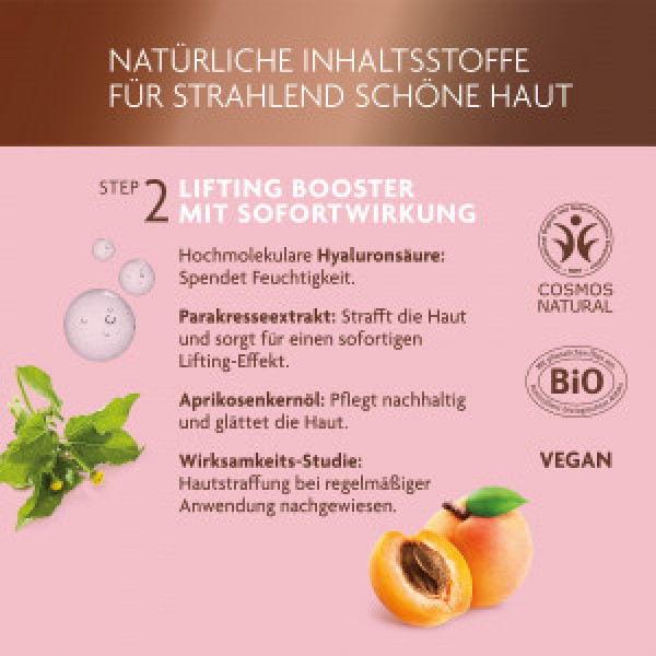 In der Clean-Maske mit weißem Lilien-Extrakt bindet die naturreine Heilerde durch ihre enorme Saugkraft im Mix mit mattierendem Bambuspuder Schmutz, Talg und Ablagerungen und reinigt so gründlich. Das glättet nachweislich die Hautoberfläche. Der anschließende Lifting-Booster enthält Parakresse – bekannt durch seine Sofortstraffungswirkung, hochmolekulare Hyaluronsäure und hochwertiges Aprikosenkernöl. Diese durchfeuchten, regenerieren und straffen die Haut sofort – mit nachweislichem Langzeit-Effekt.