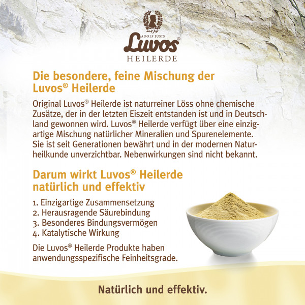 Luvos-Heilerde wird in Deutschland aus Löss hergestellt, der aus der Eiszeit stammt und eine ideale Mischung aus Mineralien und Spurenelementen aufweist. In einem speziellen Verfahren wird der Luvos-Löss schonend aufbereitet, sodass die Luvos-Heilerde ihre idealen Eigenschaften für die therapeutische Anwendung erhält. Die Heilerde-Produkte von Luvos haben verschiedene anwendungsspezifische Feinheitsgrade, um die jeweils gewünschte Wirkung zu erzielen. Luvos-Heilerde ist frei von chemischen Zusatzstoffen und auch für Veganer geeignet.
