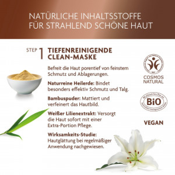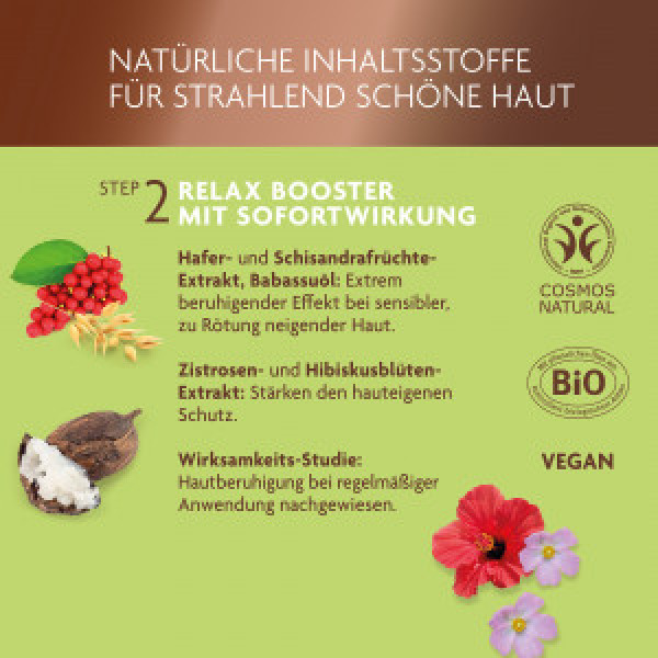 In der Clean-Maske mit weißem Lilien-Extrakt bindet die naturreine Heilerde durch ihre enorme Saugkraft im Mix mit mattierendem Bambuspuder Schmutz, Talg und Ablagerungen und reinigt so gründlich. Das glättet nachweislich die Hautoberfläche. Der anschließende Relax-Booster pflegt die Haut mit Hafer- und Schisandra-Extrakt, Zistrosen- und Hibiskus-Essenzen sowie Babussuöl. Diese beruhigen irritierte, gerötete Haut, stärken und regenerieren die Hautbarriere und glätten Trockenheitsfältchen – schnell und nachhaltig.