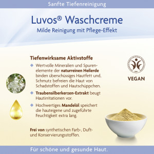 Zertifizierte Naturkosmetik, hergestellt in Deutschland: Das Familienunternehmen Luvos mit 100-jähriger Tradition stellt dieses Produkt nach höchstem Standard von BDIH her. Es ist selbstverständlich vegan, tierversuchsfrei. Die Hautverträglichkeit ist dermatologisch bestätigt. Die Waschcreme ist vollkommen frei von problematischen Zusatzstoffen wie Mikroplastik, Mineralöl, Parabenen, Silikonen, Paraffinen, PEGs, künstlichen Farb-, Duft- und Konservierungsstoffen.