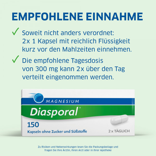 Magnesium-Diasporal® 150, Kapseln (Wirkstoff: Magnesiumoxid) Anwendungsgebiet: Magnesiummangel, wenn er Ursache für Störungen der Muskeltätigkeit (Neuromuskuläre Störungen, Wadenkrämpfe) ist. Zu Risiken und Nebenwirkungen lesen Sie die Packungsbeilage und fragen Sie Ihren Arzt oder Apotheker. Protina Pharm. GmbH, D-85737 D-Ismaning