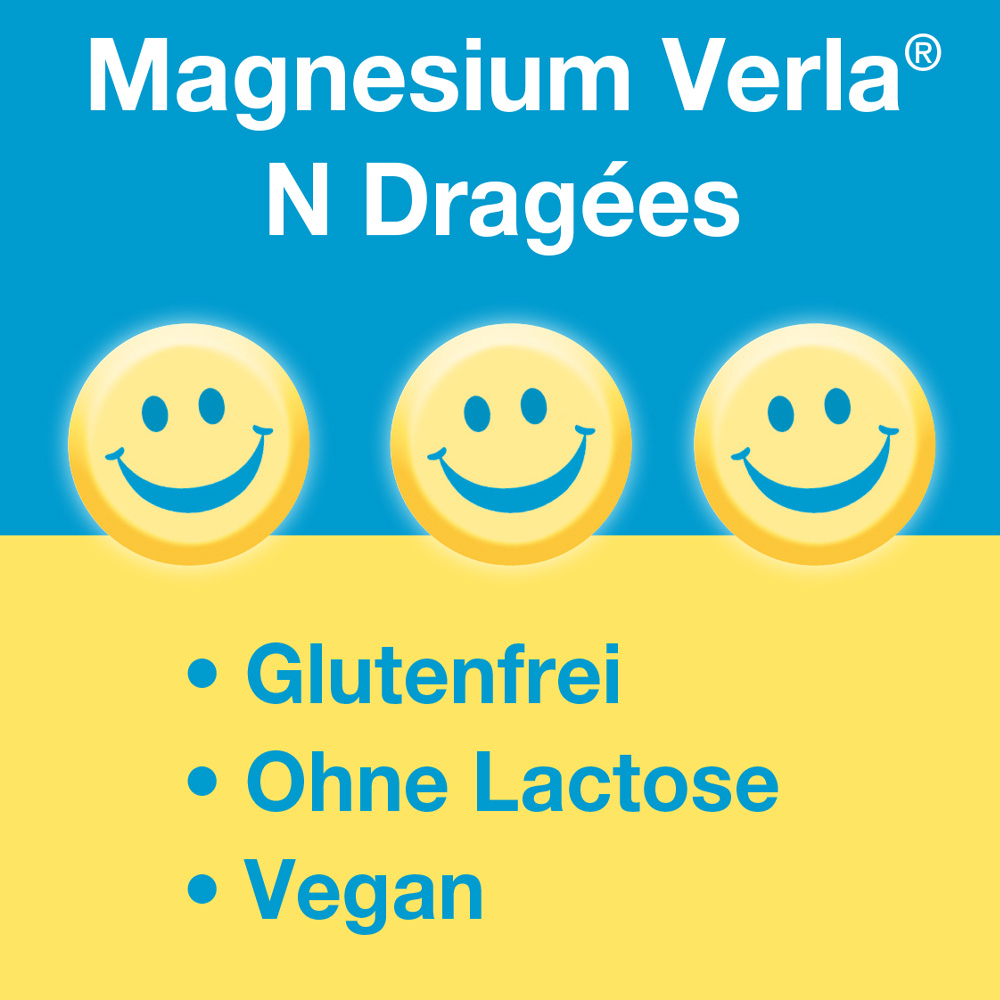 Seit mehr als 65 Jahren bewähren sich Magnesium Verla® N Dragées als Arzneimittel mit höchsten Qualitätsstandards in der Therapie von Magnesiummangelzuständen. Magnesium wird am besten vom Körper aufgenommen, wenn kleinere Mengen über den Tag verteilt eingenommen werden. Durch die niedrige Dosierung von Magnesium Verla® N Dragées sind sie individuell gut dosierbar und können ganz nach Bedarf zu verschiedenen Tageszeiten eingenommen werden. Sie haben einen leckeren Geschmack nach Vanille und lassen sich sehr leicht schlucken. Die magensaftresistenten Dragées sind außerdem gut verträglich. Zusätzlich werden in Magnesium Verla® N Dragées ausschließlich organische Magnesiumverbindungen für eine gute Aufnahme und Bioverfügbarkeit im Körper verwendet.
