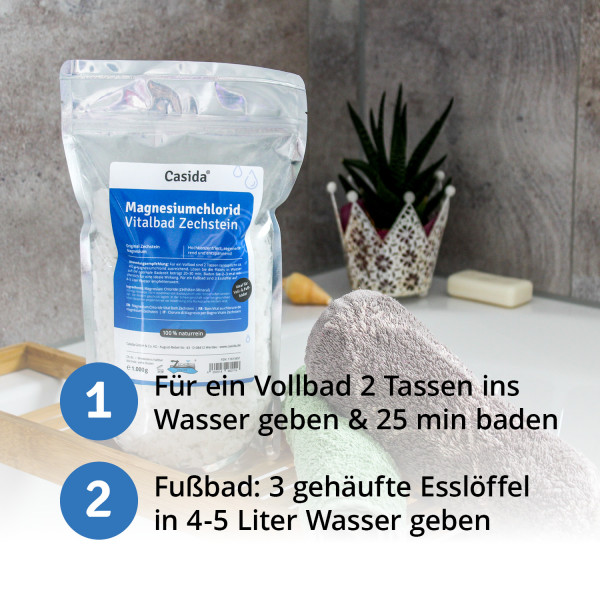 - Magnesiumreicher Badezusatz für Fuß- und Vollbäder.