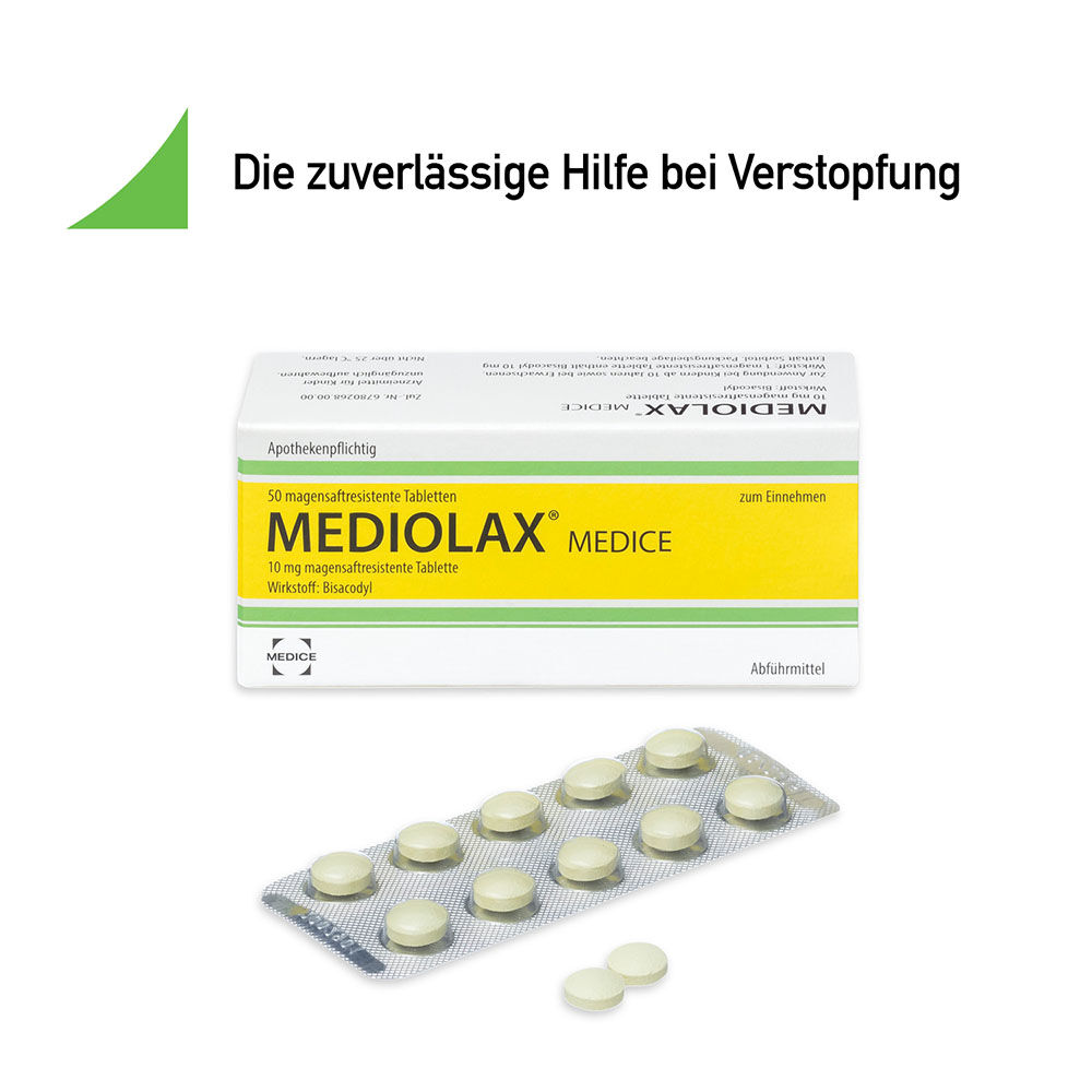 Die Einnahme von Abfu?hrmitteln soll bei Verstopfung nur kurzfristig erfolgen. Im Allgemeinen wird eine Behandlung mit Mediolax Medice erst dann empfohlen, wenn Sie mit Veränderung Ihrer Ernährung (durch vermehrte Aufnahme von Ballaststoffen und einer ausreichenden Flu?ssigkeitsaufnahme) sowie durch Änderung Ihres Lebensstils (mit ausreichender körperlicher Bewegung) keinen oder noch keinen ausreichenden Erfolg erzielen konnten!