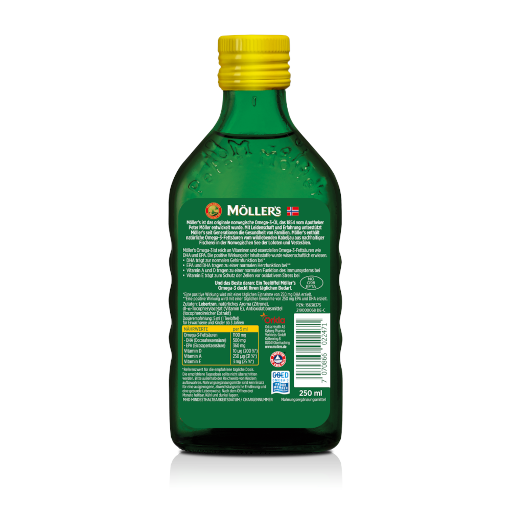 Möller’s ist das wohlschmeckende, original norwegische Omega-3-Öl, das seit 1854 einen wertvollen Beitrag zur Gesundheit der skandinavischen Bevölkerung leistet. Omega-3-Fettsäuren gehören zu den lebenswichtigen Nährstoffen, die der Körper nicht selbst produzieren kann. Sie kommen v.a. in fettem Fisch wie Lachs oder Hering vor, aber wer nicht gerne Fisch isst, kann mit nur einem Teelöffel Möller‘s pro Tag seinen Bedarf ganz einfach und bekömmlich decken. Möller’s – Ein Löffel voll Leben für die ganze Familie.