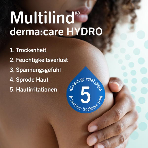 MULTILIND® DERMA:CARE HYDRO FEUCHTIGKEITS-DUSCHGEL: KLINISCH GESTESTET GEGEN 5 ANZEICHEN TROCKENER HAUT Multilind® derma:care HYDRO Feuchtigkeits-Duschgel sorgt für sanfte Reinigung und Beruhigung bei der täglichen Pflege trockener Haut. 1. Trockenheit 2. Feuchtigkeitsverlust 3. Spannungsgefühl 4. Spröde Haut 5. Hautirritationen Die Hautpflegeserie Multilind® derma:care HYDRO wurde speziell entwickelt, um die 5 häufigsten Anzeichen trockener Haut zu bekämpfen sowie die Beschaffenheit und das Hautgefühl zu verbessern. Sie dient zur täglichen Pflege trockener und sehr trockener Haut sowie zur Spezialpflege besonders trockener und rauer Hautareale. Alle Produkte ziehen schnell ein, fetten nicht und sind für empfindliche Haut geeignet