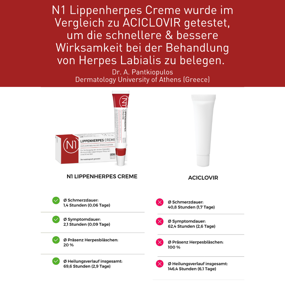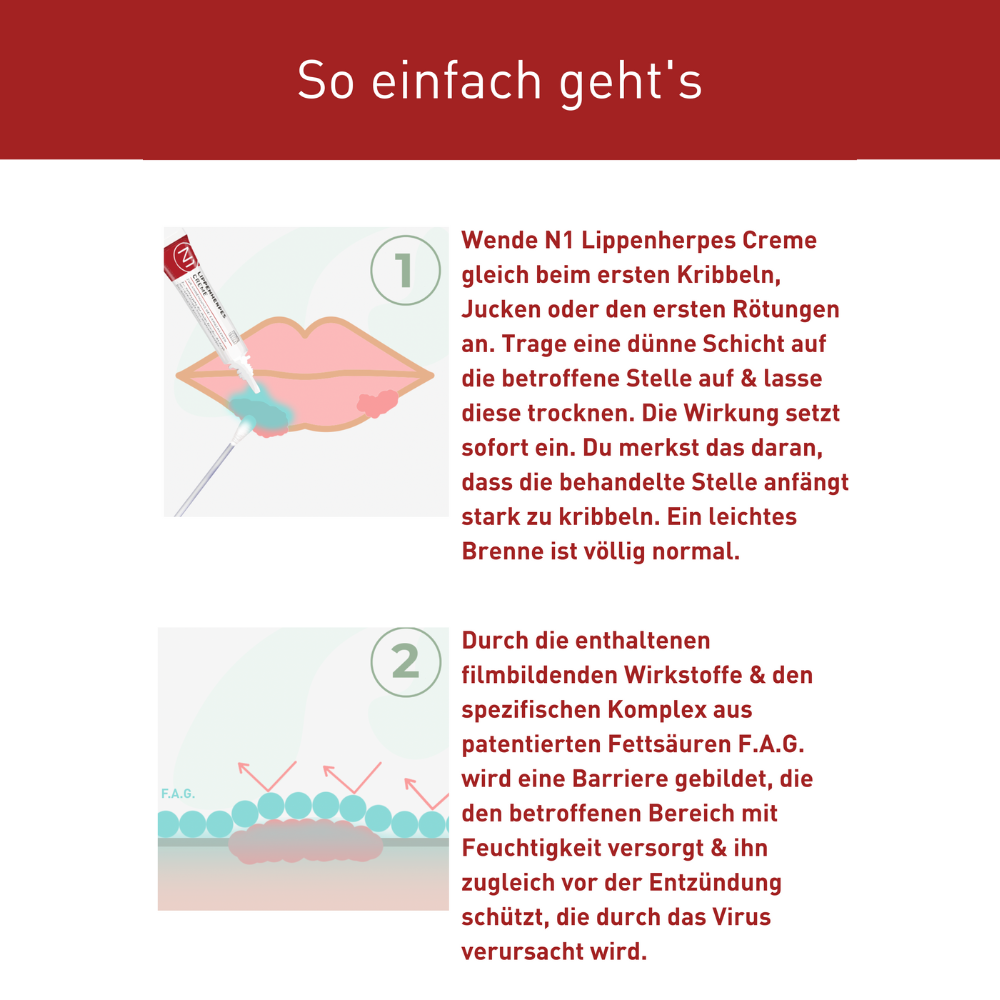 - Verhindert die Bläschenbildung und stoppt die Virenvermehrung