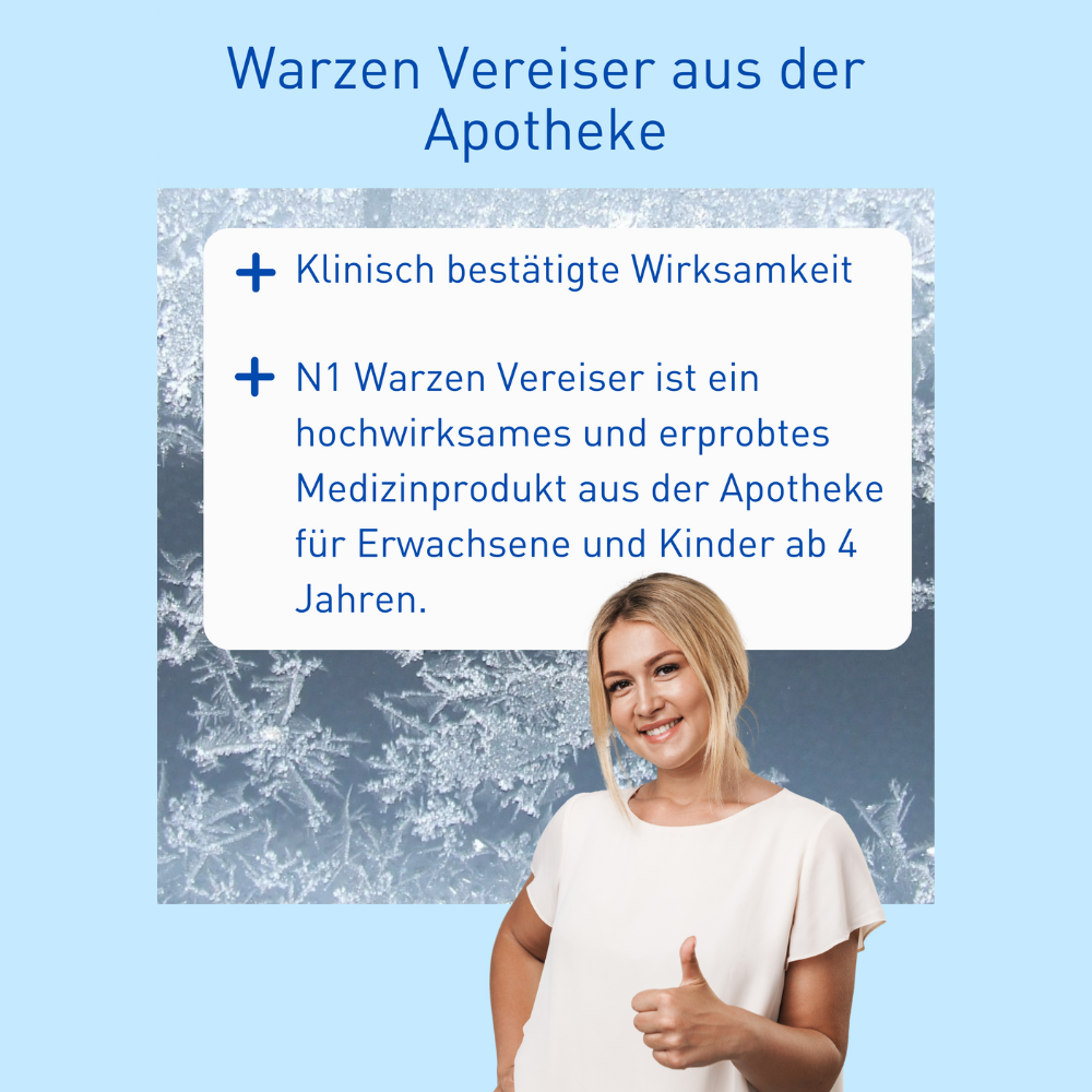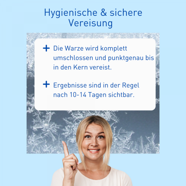 Der N1 Warzen Vereiser ist eine wirksame Methode der Warzen Vereisung, da die Warzen komplett umschlossen und punktgenau bis in den Kern vereist werden. Die Ergebnisse sind in der Regel nach 10-14 Tagen sichtbar.