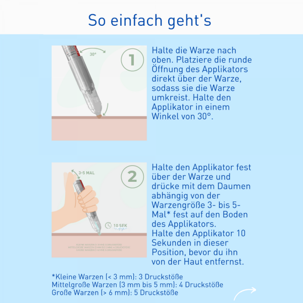 Vorsichtsmaßnahme: Wenn eine Gruppe von Warzen eng beieinander liegt, sollte jede Warze separat in einem Abstand von 14 Tagen zwischen den Anwendungen behandelt werden. In den meisten Fällen ist eine einzige Behandlung ausreichend, um die Warze zu entfernen. Bei hartnäckigen Warzen kannst du die Behandlung nach 10 Sekunden wiederholen. Wiederhole die Behandlung, wie in der Gebrauchsanweisung angegeben, wenn die Warze nicht innerhalb von 14 Tagen verschwunden sein sollte.