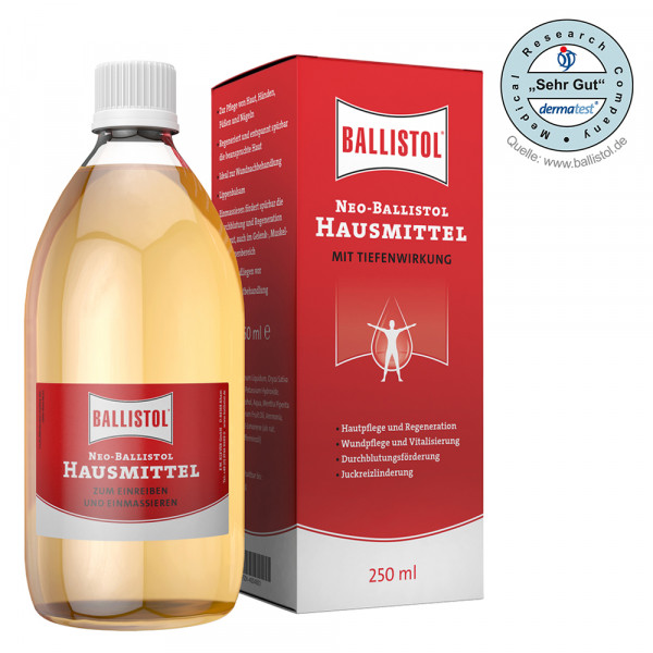 Neo Ballistol Hausmittel zur Hautpflege, Massage, Nagelpflege, Fußpflege, Wundnachbehandlung und bei anderen Beschwerden. Die 250 ml Flasche Neo Ballistol eignet sich besonders als Vorratsflasche oder für Familien.
