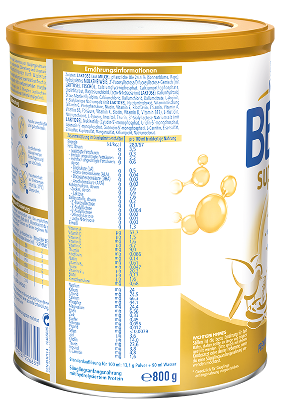 LAKTOSE (aus MILCH), Pflanzenöle 24,4 % (Sonnenblume, Raps), hydrolysiertes MOLKENEIWEIß, 2´-Fucosyllactose/Difucosyllactose-Gemisch (mit LAKTOSE), FISCHÖL, Calciumglycerophosphat, Calciumorthophosphate, Cholinbitartrat, Magnesiumchlorid, Lacto-N-tetraose (mit LAKTOSE), Kaliumhydroxid, Öl aus Mortierella alpina, Calciumchlorid, Kaliumchlorid, Kaliumcitrate, L-Arginin, 6´-Sialyllactose Natriumsalz (mit LAKTOSE), Natriumhydroxid, Vitaminmischung (Vitamin C, Pantothensäure, Niacin, Vitamin E, Riboflavin, Thiamin, Vitamin A, Vitamin B6, Folsäure, Vitamin K, Biotin, Vitamin D, Vitamin B12), L-Histidin, Natriumchlorid, L-Tyrosin, Inositol, Taurin, 3´- Sialyllactose Natriumsalz (mit LAKTOSE), Nukleotide (Cytidin-5´-monophosphat, Uridin-5´-monophosphat, Adenosin-5´-monophosphat, Guanosin-5´-monophosphat), LCarnitin, Eisensulfat, Zinksulfat, Kupfersulfat, Mangansulfat, Kaliumjodid, Natriumselenat.