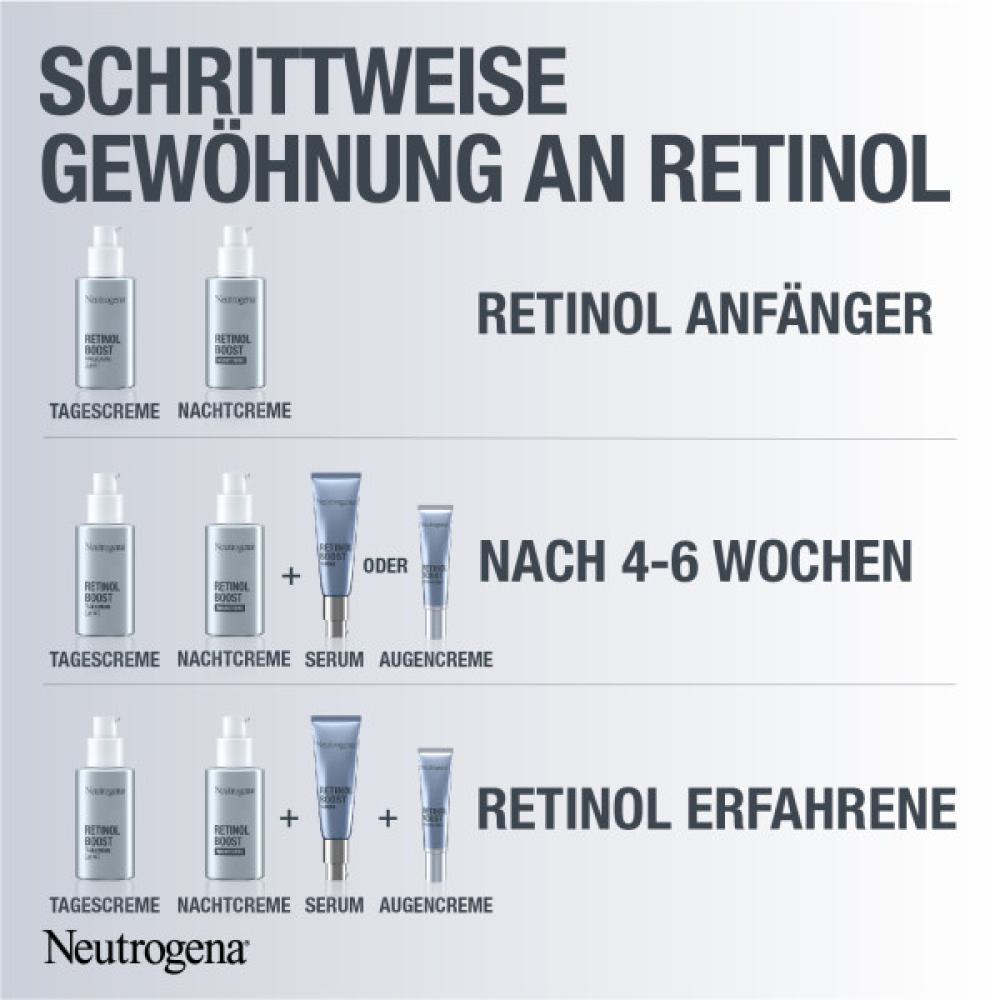 - Die parfümfreie Neutrogena Retinol Boost Augencreme bekämpft sichtbare Zeichen der Hautalterung: feine Linien, Krähenfüße und eine müde aussehende Augenpartie. Spendet Feuchtigkeit. Für jünger und gesund aussehende Haut