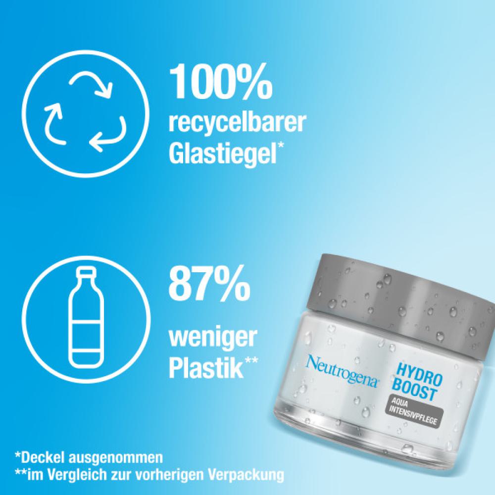 Verbesserte Formel: Die Neutrogena Hydro Boost Aqua Intensivpflege mit Hyaluron erhöht den Feuchtigkeitsgehalt der Haut und pflanzliche Trehalose hilft Feuchtigkeit einzuschließen. Gleichzeitig schützen Antioxidantien die Feuchtigkeitsbarriere vor externen Einflüssen*. Die intensive Gesichtspflege Creme im neuen Design polstert die Haut von innen auf, stimuliert die hauteigene Produktion von Hyaluronsäure und verleiht ein sichtbar glattes & pralles Hautbild. Zudem enthält die Gesichtscreme für trockene Haut im Vergleich zur vorherigen Verpackung 87% weniger Plastik und der Glastiegel ist zu 100% recycelbar**. (*in-vitro Studie) (**Deckel ausgenommen)