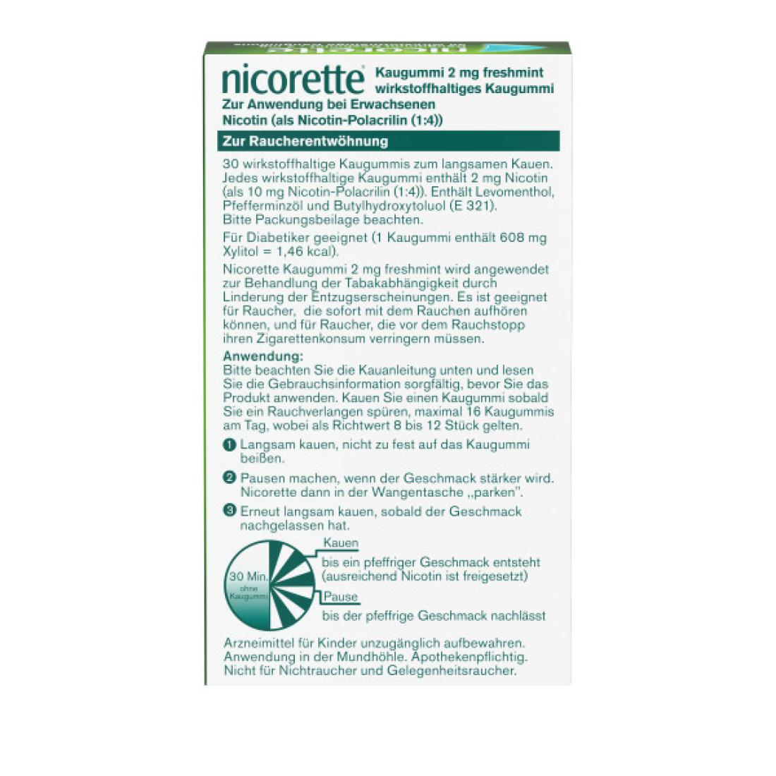 Das nicorette® Kaugummi freshmint unterstützt auf dem Weg zum Nichtraucher. Das aktive Kauen des Nikotinkaugummis setzt Nikotin frei, welches über die Mundschleimhaut in die Blutbahn gelangt und den Nikotinspiegel im Blut erhöht. Dadurch wird nicht nur Rauchverlangen, sondern auch typische Entzugserscheinungen wie innere Unruhe oder gesteigerter Appetit gelindert. Außerdem kann das aktive Kauen vom Rauchverlangen ablenken. Die nicorette® Kaugummis sind nicht nur zuckerfrei, sondern haben auch einen frischen Minzgeschmack und erfrischen den Atem. Diese Kaugummis mit 2 mg Nikotin werden empfohlen für Raucher von bis zu 20 Zigaretten pro Tag. Wenn bislang mehr als 20 Zigaretten geraucht werden, empfiehlt sich die Nikotinersatztherapie mit den höher dosierten Kaugummis mit 4 mg Nikotin.
