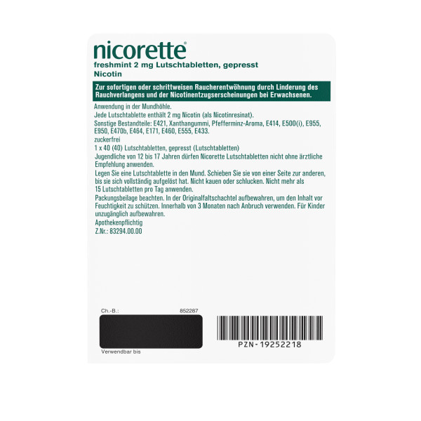 Die Anwendung ist einfach: Bei Rauchverlangen wird eine Lutschtablette auf die Zunge gelegt. Das Lutschen setzt das Nikotin frei, das über die Mundschleimhaut ins Blut gelangt. So wirken die Lutschtabletten dem Rauchverlangen und den typischen Entzugserscheinungen, die bei einem Rauchstopp auftreten können, entgegen. Dazu zählen beispielsweise gesteigerter Appetit und innere Unruhe. Die Lutschtabletten sind zuckerfrei und haben einen frischen Minzgeschmack.