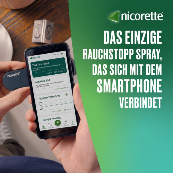 - Nicorette® Spray – jetzt mit Tracking-App „nicorette® Nichtraucher“ verbinden: trackt die Nutzung des Sprays und damit das Erreichen der selbst gesetzten Rauchstopp-Ziele