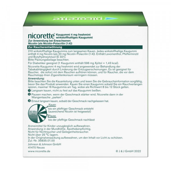 Das nicorette® Kaugummi freshmint unterstützt auf dem Weg in die Rauchfreiheit. Das aktive Kauen des Nikotinkaugummis setzt Nikotin frei, welches über die Mundschleimhaut in die Blutbahn gelangt und den Nikotinspiegel erhöht. Dadurch wird nicht nur Rauchverlangen, sondern auch typische Entzugserscheinungen wie innere Unruhe oder gesteigerter Appetit gelindert. Außerdem kann das aktive Kauen vom Rauchverlangen ablenken.