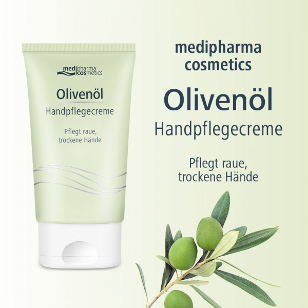 Die Olivenöl Handpflegecreme von medipharma cosmetics wurde für die speziellen Pflegebedürfnisse von rauen, trockenen Händen entwickelt. Sie enthält kaltgepresstes Olivenöl und hautpflegendes Jojobaöl, welche die Haut vor dem Austrocknen schützen und sie zart und geschmeidig pflegen. Die Hände fühlen nach der Anwendung zart und gepflegt an. Zurück bleibt ein geschmeidiges Hautgefühl und der mediterrane Duft unserer beliebten Olivenöl Pflegeserie.