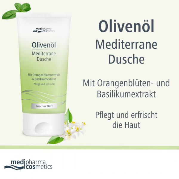 Die Olivenöl Mediterrane Dusche verführt Sie beim Duschen mit einem frischen Duft und lässt somit die tägliche Körperpflege zu einem mediterranen Erlebnis werden - der Urlaub für Zuhause. Träumen Sie sich schon früh morgens durch enthaltene Orangenblüten- und Basilikumextrakten in den warmen Süden. Das Duschgel entwickelt sich auf der Haut zu einem zart-cremigen Schaum. Angereichert mit Panthenol und Olivenöl schützt die Mediterrane Dusche die Haut vor dem Austrocknen und pflegt sie gleichzeitig samtig-weich. Hautverträglichkeit dermatologisch geprüft.