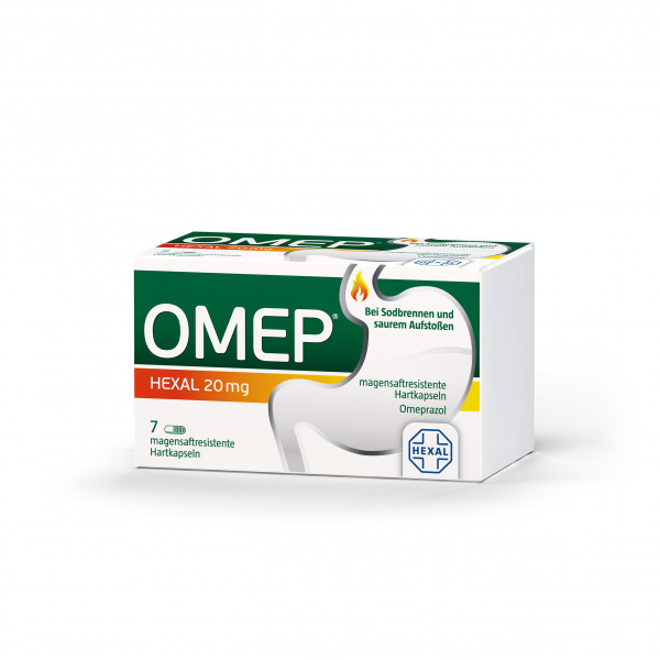 OMEP® HEXAL 20 mg, magensaftresistente Hartkapseln : Wirkstoff: Omeprazol. Anwendungsgeb.: kurzzeitige Behandlung von Refluxbeschwerden (z. B. Sodbrennen, Säurerückfluss) bei Erwachsenen. Enthält