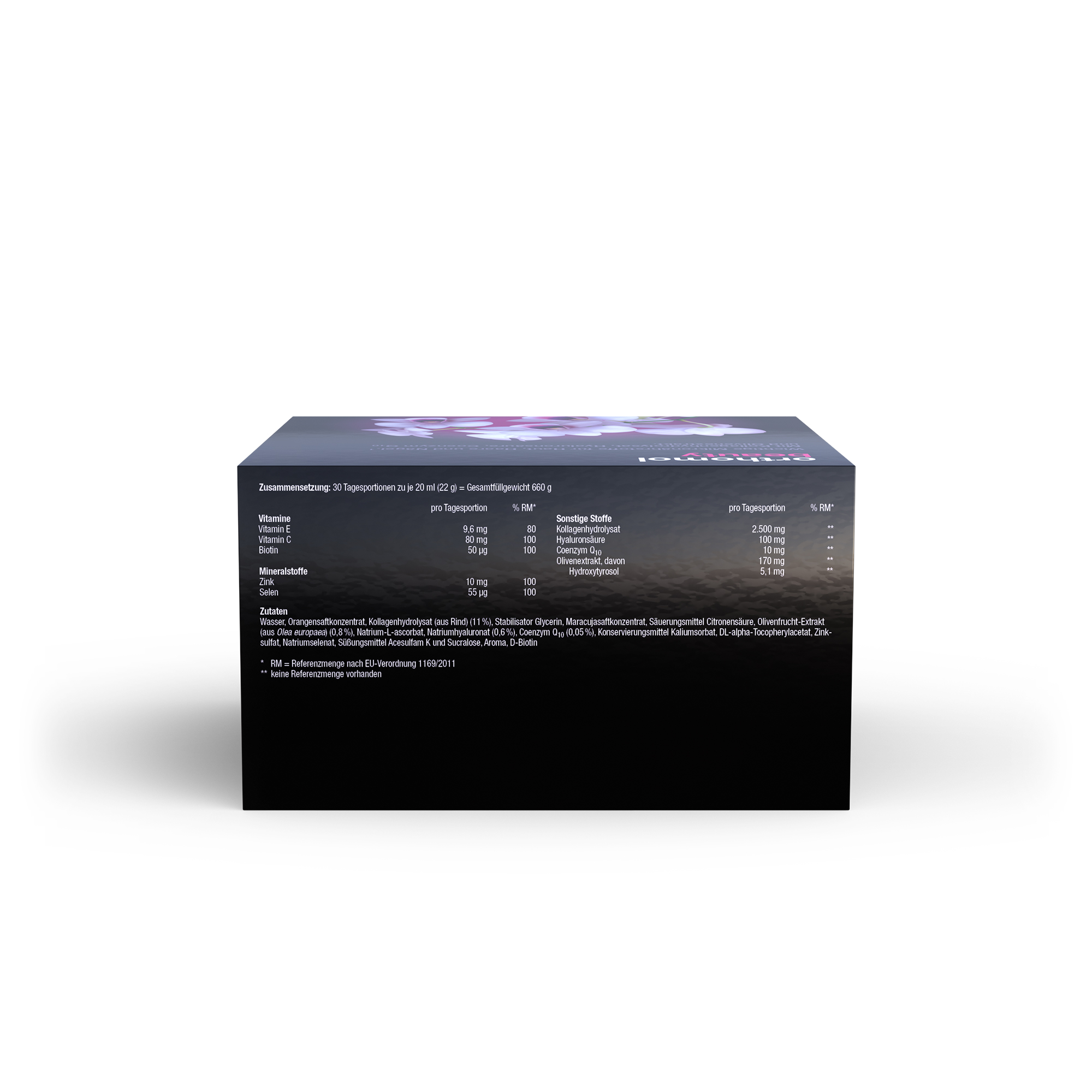 Mit Kollagenhydrolysat, Hyaluronsäure, Coenzym Q10 und Olivenfrucht-Extrakt.