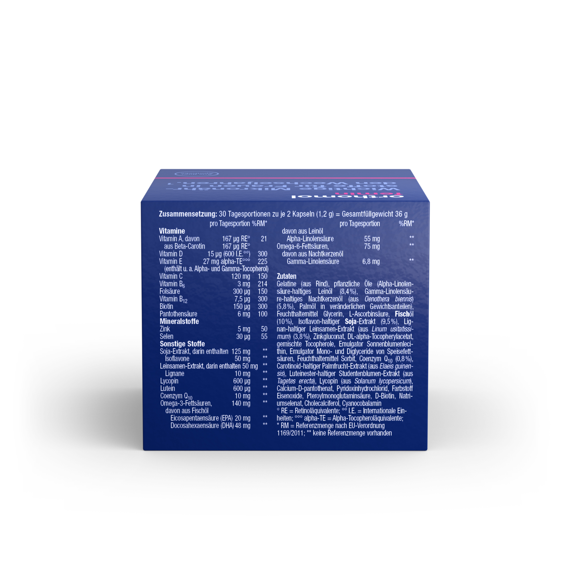 Gelatine (aus Rind), pflanzliche Öle (Alpha-Linolensäure-haltiges Leinöl (8,4 %), Gamma-Linolensäure-haltiges Nachtkerzenöl (aus Oenothera biennis) (5,8 %), Palmöl in veränderlichen Gewichtsanteilen), Feuchthaltemittel Glycerin, L-Ascorbinsäure, Fischöl (10 %), Isoflavon-haltiger Soja-Extrakt (9,5 %), Lignan-haltiger Leinsamen-Extrakt (aus Linum usitatissmum) (3,8 %), Zinkgluconat, DL-alpha-Tocopherylacetat, gemischte Tocopherole, Emulgator Sonnenblumenlecithin, Emulgator Mono- und Diglyceride von Speisefettsäuren, Feuchthaltemittel Sorbit, Coenzym Q10 (0,8 %), Carotinoid-haltiger Palmfrucht-Extrakt (aus Elaeis guinensis), Luteinester-haltiger Studentenblumen-Extrakt (aus Tagetes erecta), Lycopin (aus Solanum lycopersicum), Calcium-D-pantothenat, Pyridoxinhydrochlorid, Farbstoff Eisenoxide, Pteroylmonoglutaminsäure, D-Biotin, Natriumselenat, Cholecalciferol, Cyanocobalamin.