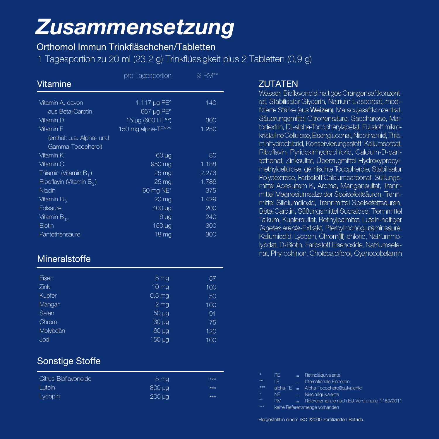 Im Falle von Orthomol Immun werden gemäß der entsprechenden Zweckbestimmung die Höchstmengen von Vitamin E, C, Thiamin (Vitamin B1), Riboflavin (Vitamin B2), B6 und Biotin über- und die Mindestmengen der Vitamine D und K sowie der Mineralstoffe Natrium, Eisen, Kupfer und Molybdän unterschritten.