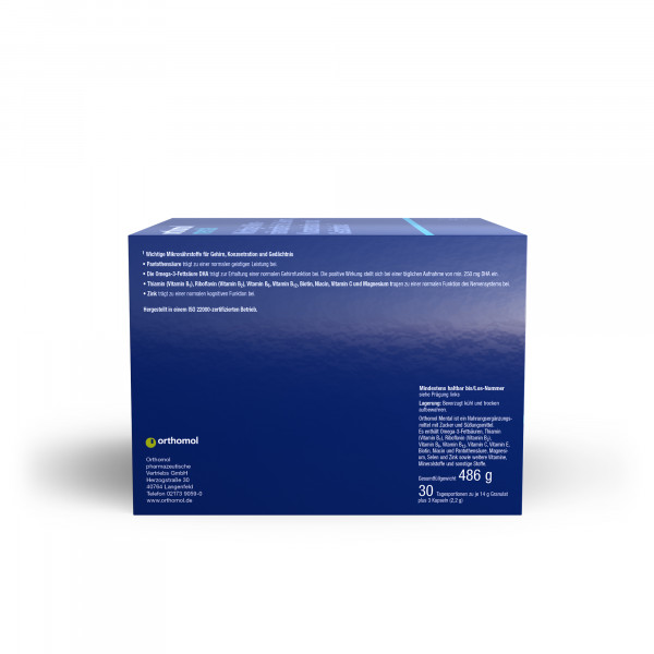 Orthomol Mental ist ein Nahrungsergänzungsmittel. Wichtige Mikronährstoffe für Gehirn, Konzentration und Gedächtnis. Mit Pantothensäure für die mentale Leistungsfähigkeit.