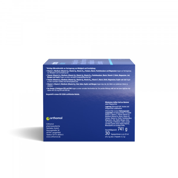 OrthomolNahrungsergänzungsmittel sind kein Ersatz für eine ausgewogene und abwechslungsreiche Ernährung und eine gesunde Lebensweise. Die angegebene empfohlene tägliche Verzehrsmenge darf nicht überschritten werden. Außerhalb der Reichweite von kleinen Kindern aufbewahren.