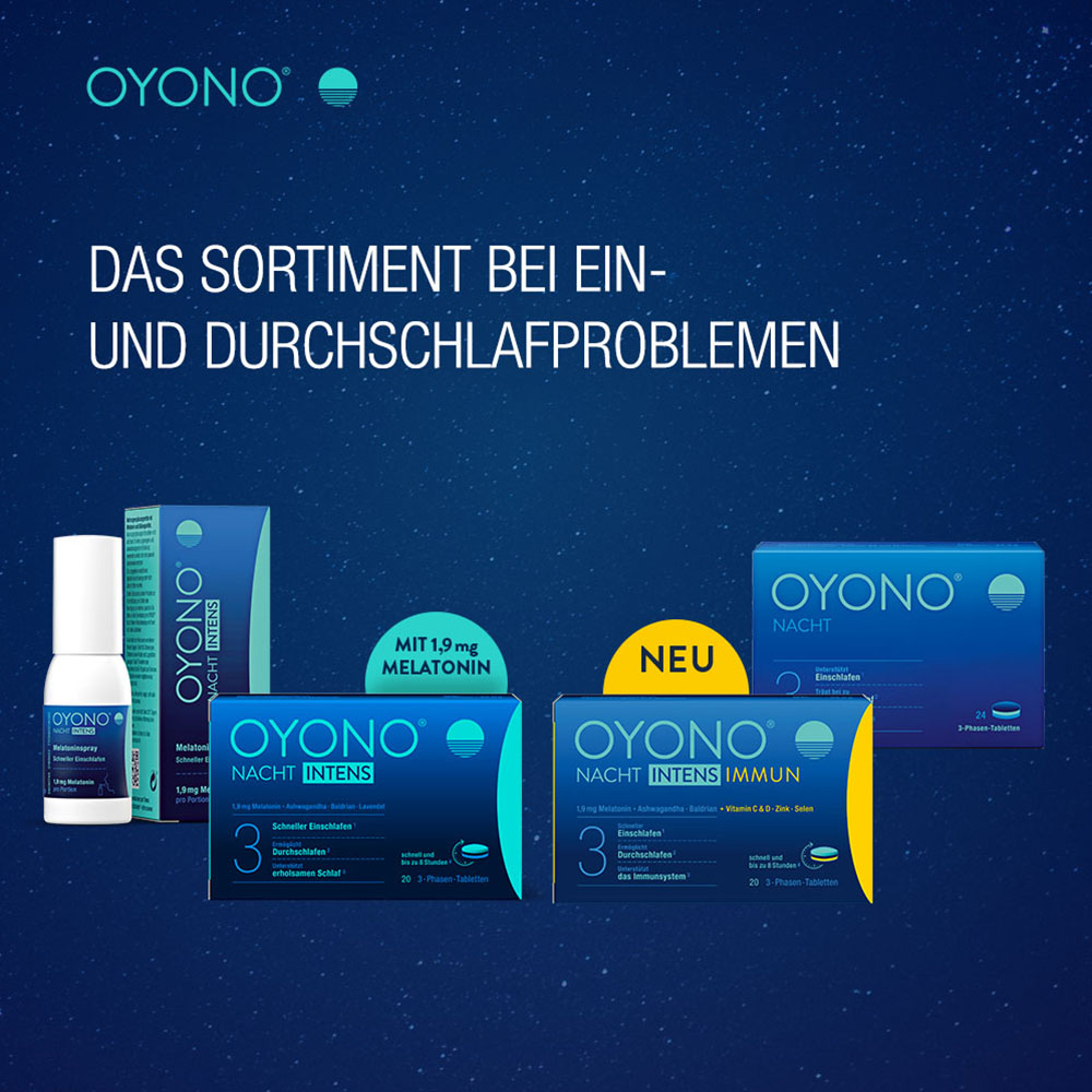 Für alle, die von Ein- und Durchschlafproblemen betroffen sind und zugleich den persönlichen Bedarf haben, ihr Immunsystem zu unterstützen, bietet OYONO® NACHT INTENS IMMUN aus dem OYONO®-Sortiment eine abgestimmte Produktauswahl. OYONO® NACHT INTENS IMMUN kombiniert 1,9 mg Melatonin und schlaffördernde Pflanzenextrakte aus Baldrian und Ashwagandha mit den immununterstützenden Inhaltsstoffen Vitamin C, Vitamin D, Zink und Selen.