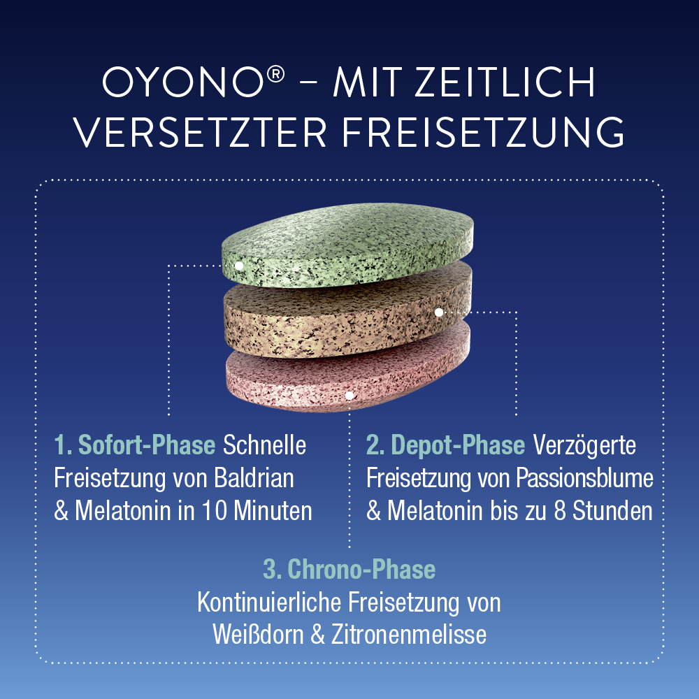 OYONO® Nacht ist eine innovative 3-Phasen-Tablette mit ausgewählten pflanzlichen Inhaltstoffen kombiniert mit dem körpereigenen Stoff Melatonin.