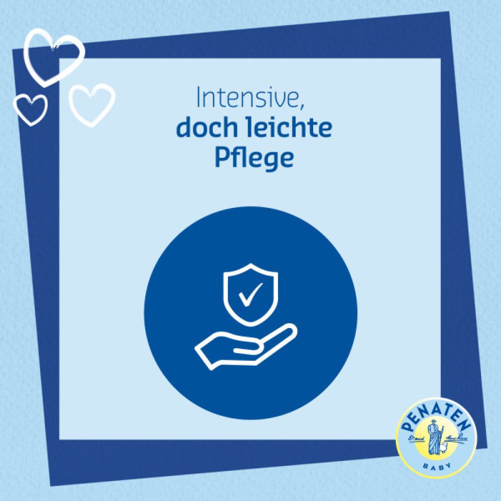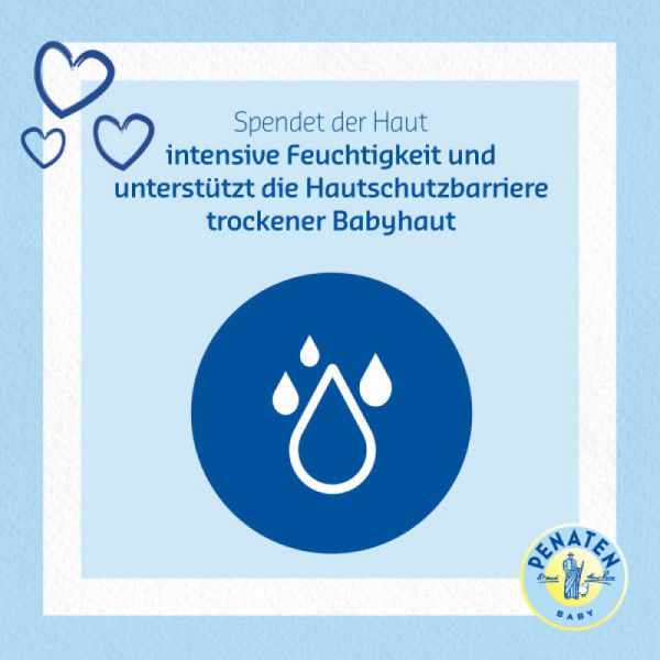 • Die PENATEN Intensiv Baby Pflegemilch zieht schnell ein, spendet der Haut intensive Feuchtigkeit und unterstützt die Hautschutzbarriere trockener Babyhaut